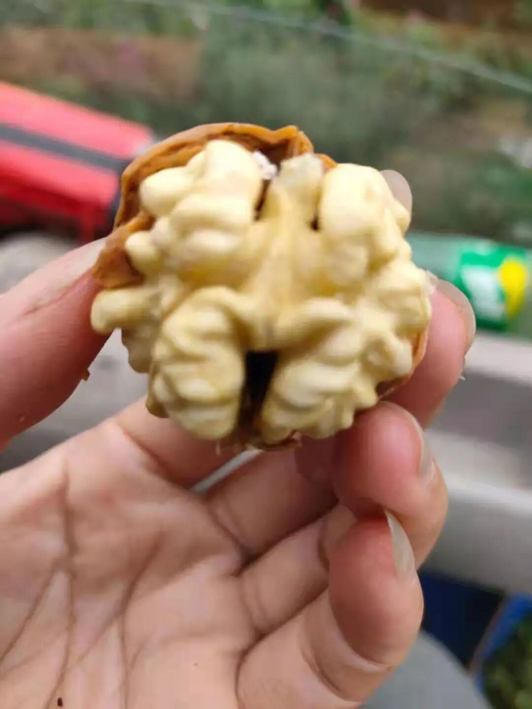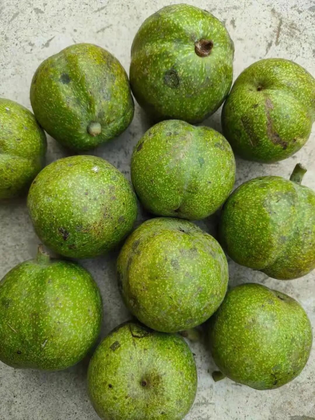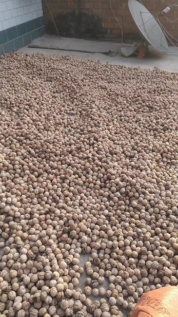 基本都是4,5十年的老树,这种核桃皮比较硬,不好剥,可能需要借助锤子之类的工具(但是味道比新品种薄皮的好,吃起来更香);外层青皮都是手动剥的,剥的并不是很干净,所以会有一些黑色的残留成分,这个不是大问题。剥掉外面青皮,晒干后卖给进村收的商贩价格能达到3块钱左右。我想在公众号卖6块钱一斤(不包括运费)。