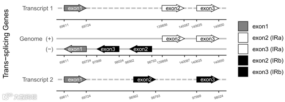 反式剪接指的是两条不同的pre-mRNA的外显子连接到一起。与正常的顺式剪接不同,这里的两段外显子是来自不同的pre-mRNA的,但却可能来自同一基因。