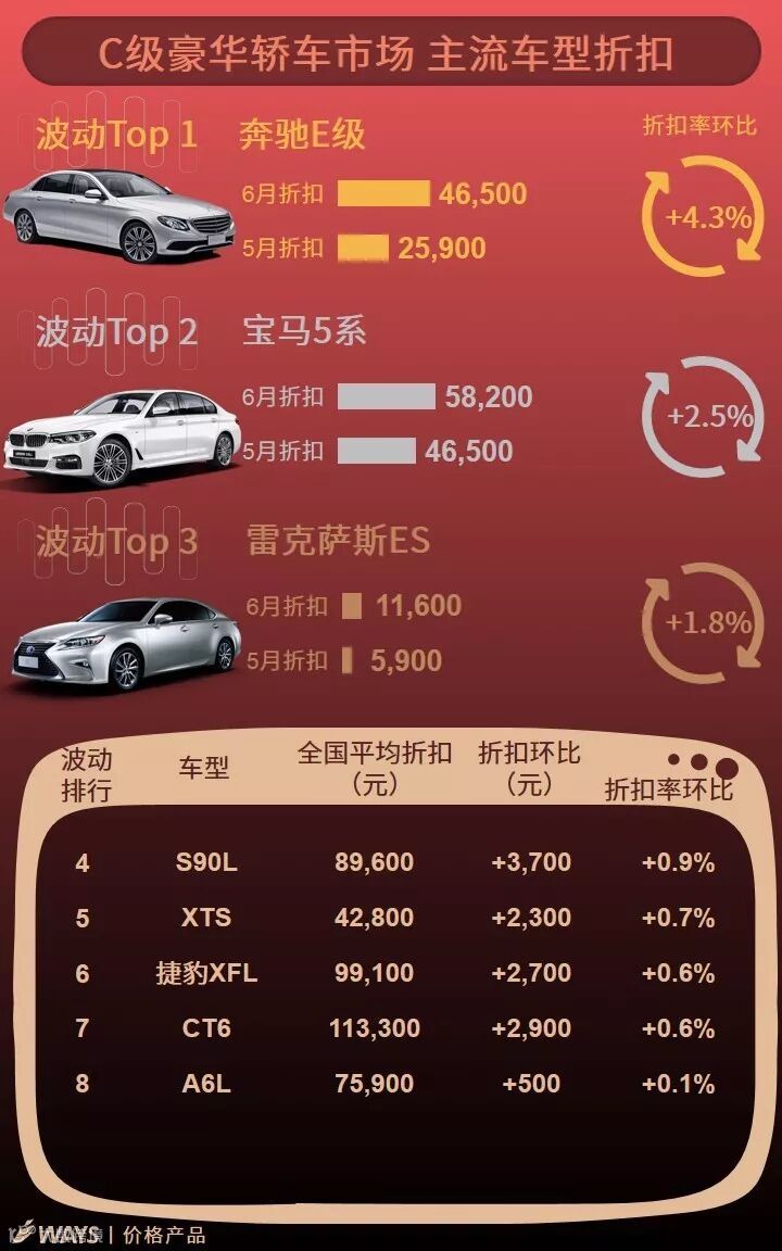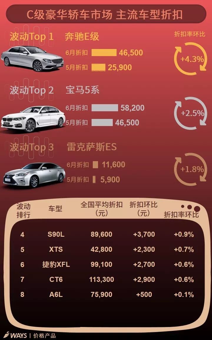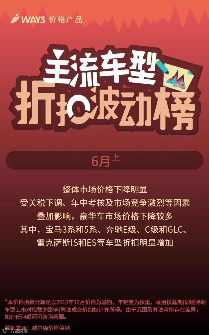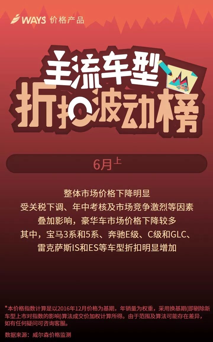 2018年6月上半月,上半年年中考核即将来临,各地经销商加大优惠力度,整体市场价格下降明显。其中,豪华车市场受关税下调及市场竞争激烈等因素叠加影响降幅明显,C级细分市场价格降幅达1.5%。