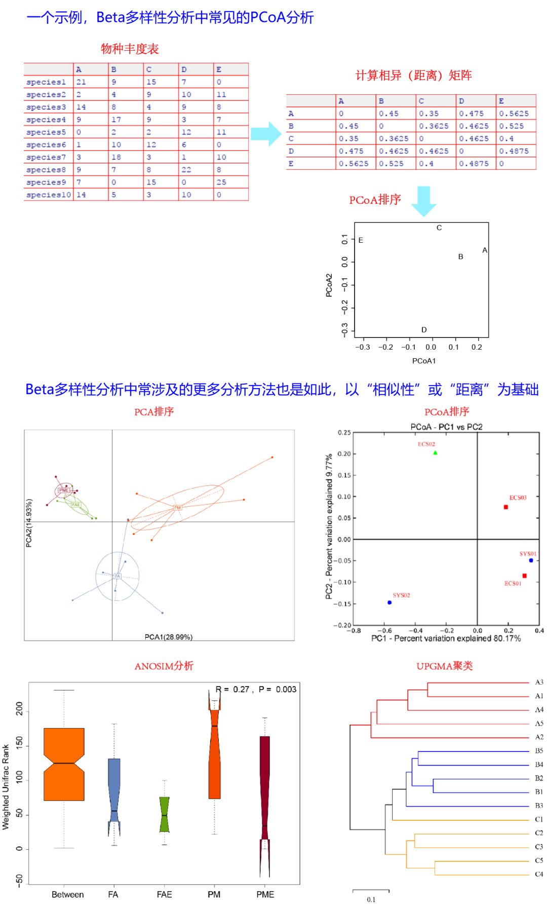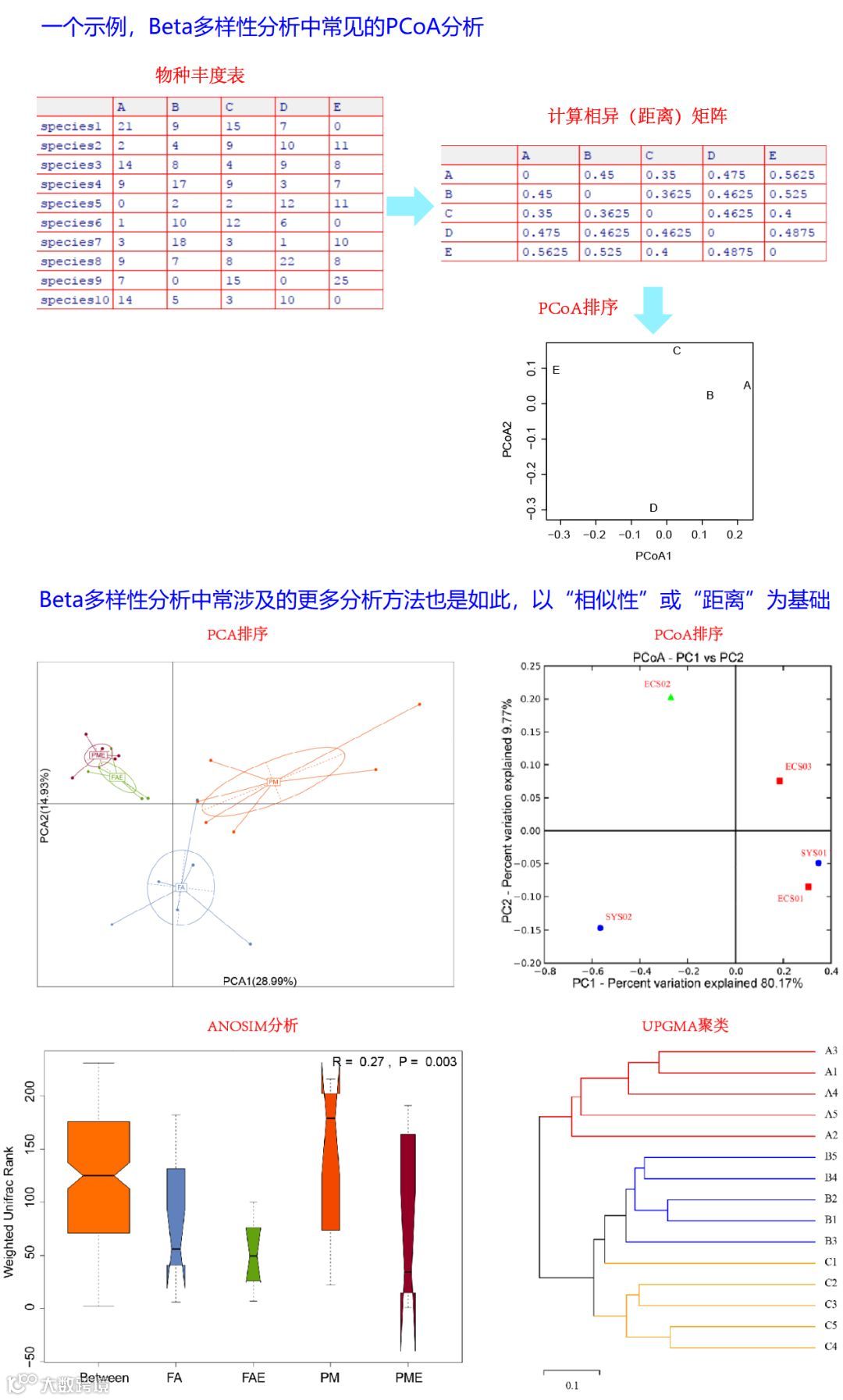 生态学数据分析中的很多统计方法都以样方之间的相似性或距离为基础。例如Beta多样性分析中常使用的非约束排序(如PCA、PCoA等)、层次聚类(如UPGMA等)等。即使对于PCA(主成分分析)和CA(对应分析),尽管它们的输入数据是物种矩阵,但实质上在计算时也分别基于欧几里得(euclidean)和卡方(chi-square)距离考虑的。