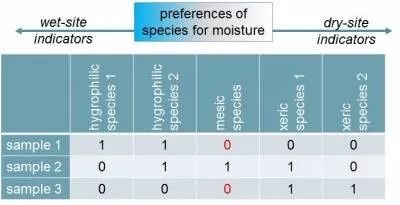下面以一示例展示两种类型的指数在处理双零现象时的区别。由环境样品1至3,环境中的湿度依次降低。对于样品1和3,未观测到包含相同物种的存在,特别是对于“mesic species”这个物种来讲,产生“双零”。缺失物种的事实并没有说明两个样本之间的生态相似性或差异,因此最好忽略它。在对称指数的情况下,样品1和样品3中不存在的物种“mesic species”(0-0)会被考虑在内,这将增加样品1和3的相似性(或着说降低差异); 而在非对称指数中,样品1和样品3中均不存在的物种“mesic species”将被忽略,只考虑(至少有一个)存在情形(1-1,1-0,0-1)。相较二者,再结合上述“双零问题”中对物种缺失成因的描述,非对称指数的处理方式更为合理。