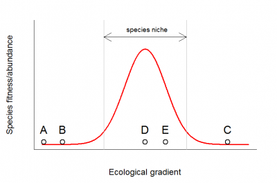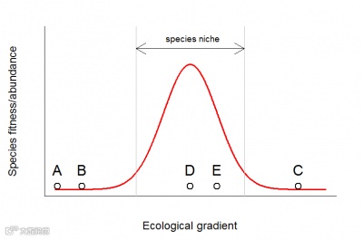 (2)样方位于物种生态位内(如下图所示的D、E两个样方),但是未被观测到。未被观测到的原因,可能是该物种恰好没有在我们所调查的区域出现(扩散限制),也可能仅仅由于采样误差而未被收集到,或者由于丰度太低而被忽视等。
