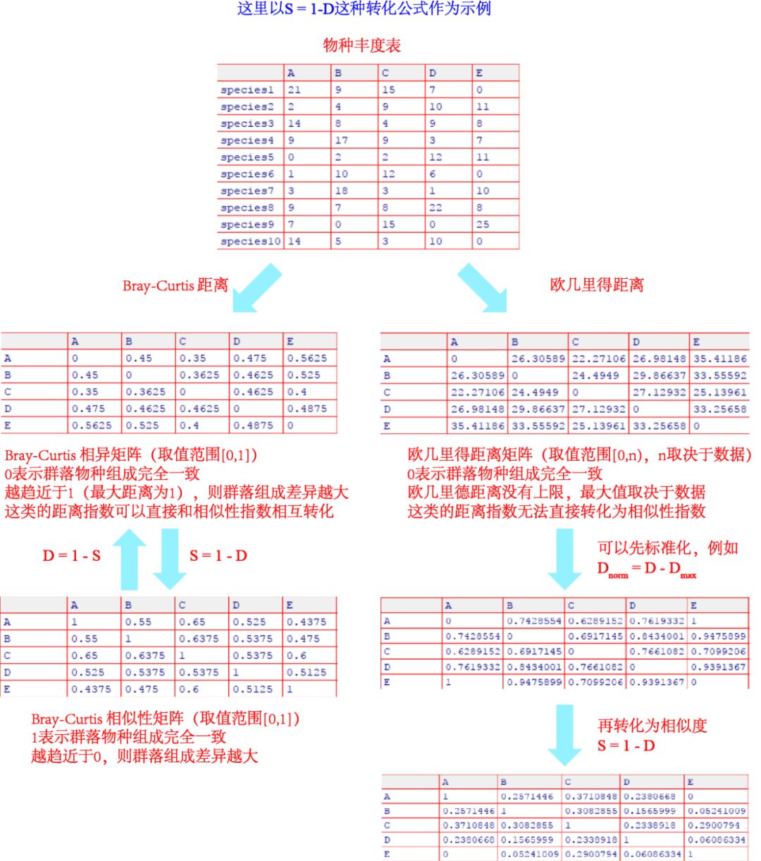 (1)同上式,某些距离指数也可以反过来直接转化为相似性指数。例如定量数据的相异百分率(也称为Bray-Curtis距离)等,这些距离类型的最大取值为1,因此和相似性指数相互转换的公式也和上式一致: