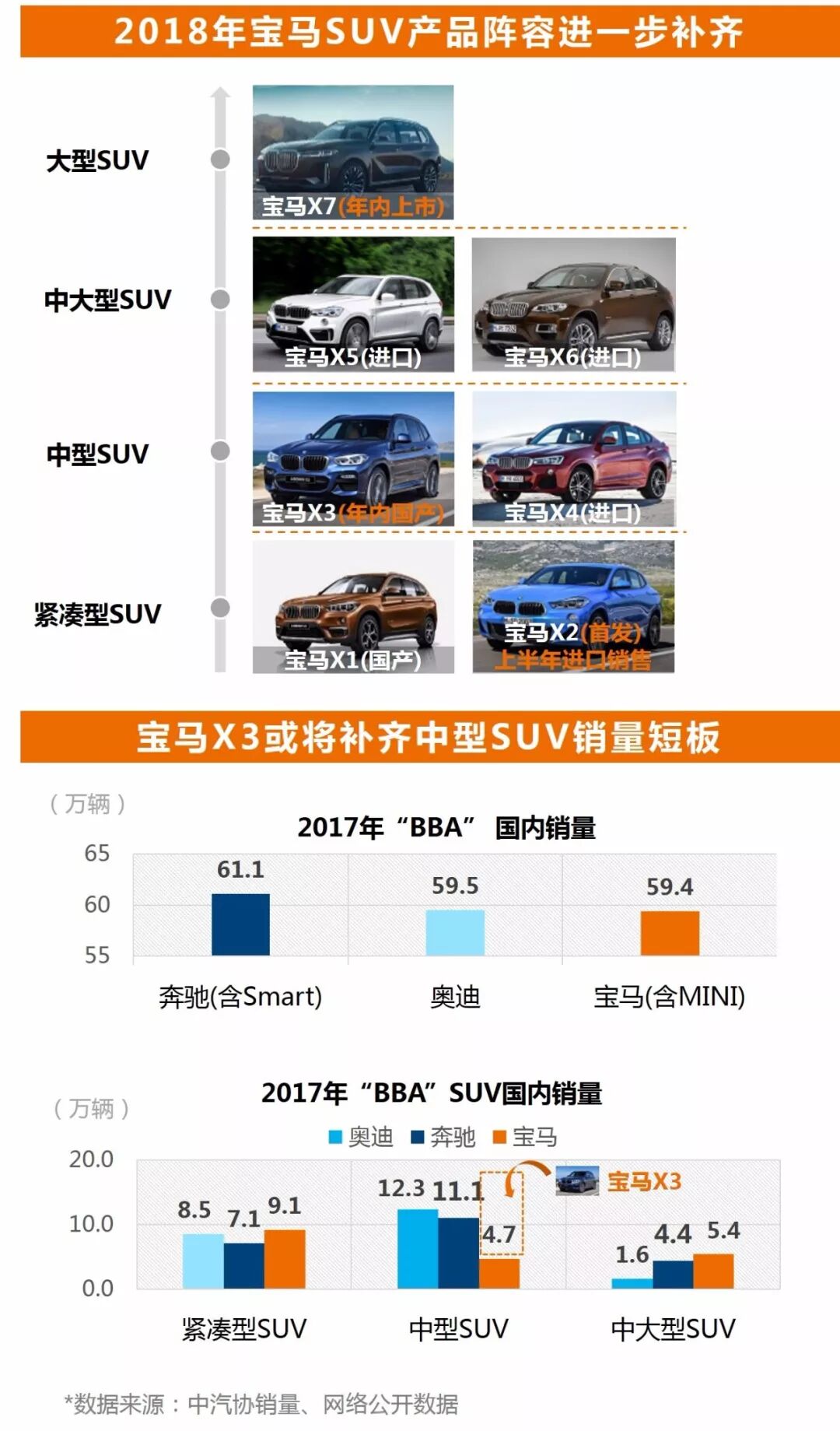 2018年在中国市场,宝马将推出全新X2、国产X3以及全新旗舰X7三款重点新车,欲通过完善SUV产品线,以及强化产品竞争力来争夺豪华品牌年度销量冠军。