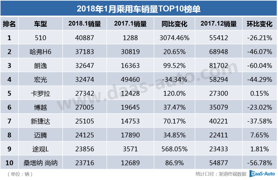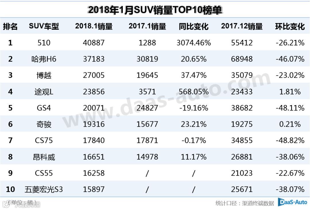 SUV市场方面,1月销量同比也有所增长,增幅为25.82%,达990356辆。其中,宝骏510以绝对优势超越所有对手,占领榜单首位。而常年位居第一的哈弗H6则退居第二,当月销量为37183辆,而博越排名第三,同比增长37.47%至27005辆。