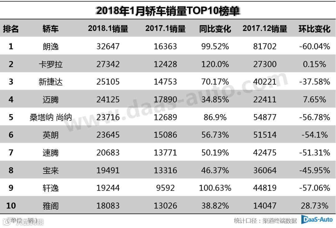 轿车市场方面,1月销量同比有所增长,涨幅为31.75%,达949149辆。其中朗逸以32647辆的成绩超越捷达,拿下销量冠军,同比增幅更是达到99.52%,整体表现亮眼。紧随其后的卡罗拉,同比攀升120%,销量为27342辆。