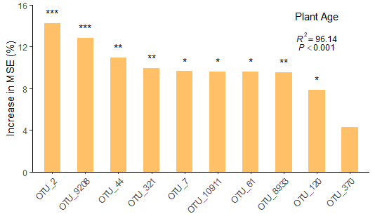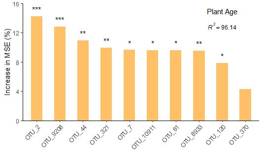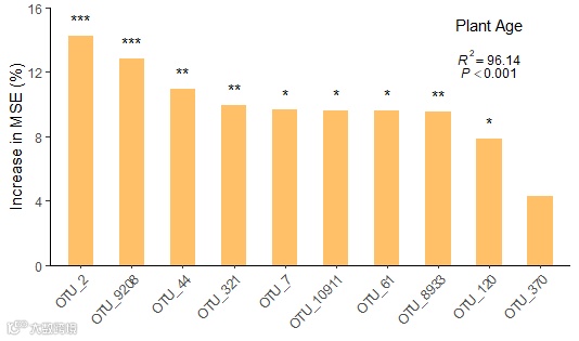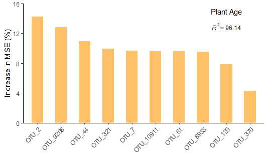 在这里,我们期望通过随机森林拟合这10种根际细菌OTU丰度与植物生长时期的响应关系,以得知哪些根际细菌OTU更能指示植物年龄。