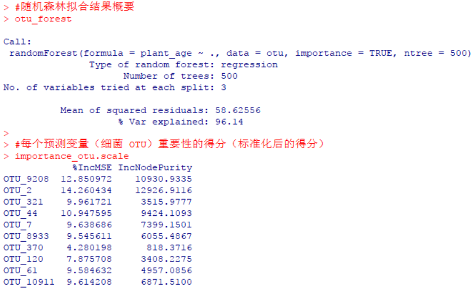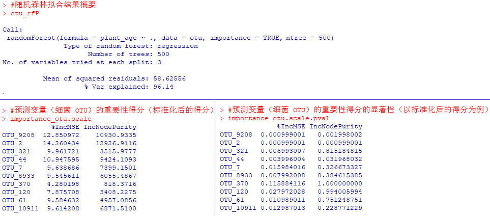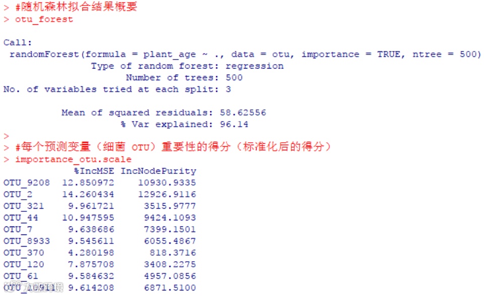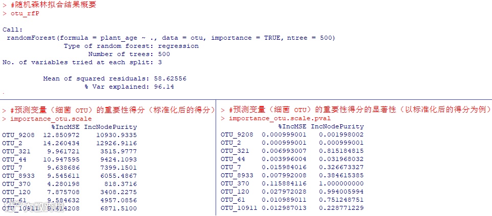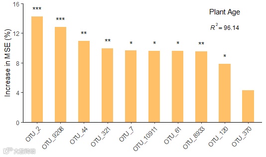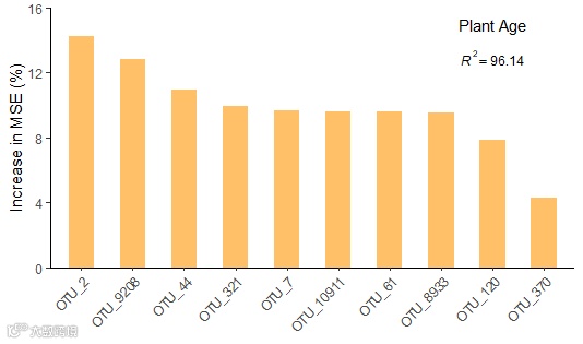 如前所述,结果中“% Var explained”体现了预测变量(用于回归的10个细菌OTU)对响应变量(植物年龄)有关方差的整体解释率,这里为96.14%,反映了这个随机森林模型很高的拟合优度。