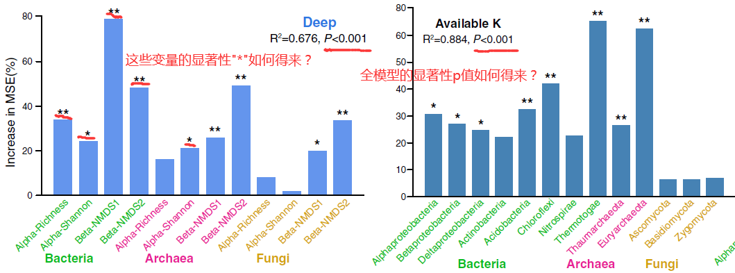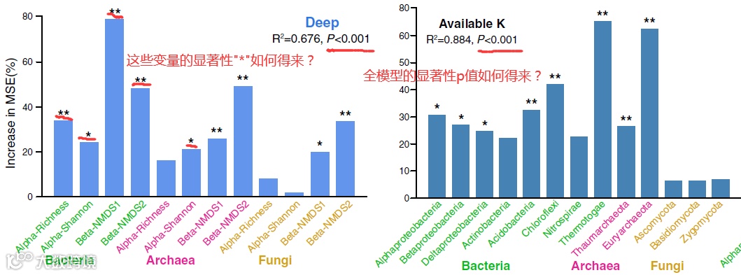 截图来自Jiao等(2018)的图5部分。左图展示了细菌、古细菌和真菌群落的α和β多样性在贡献深层土壤多养分循环指数中的重要性;右图展示了优势微生物分类群与土壤可利用钾的关系。两个图中变量的重要性以随机森林中的“percentage of increase of mean square error”(Increase in MSE(%))值进行衡量,更高的MSE%值意味着更重要的变量,并标识了各变量的显著性。图上方的数值为总方差解释率,以及全模型的显著性p值。