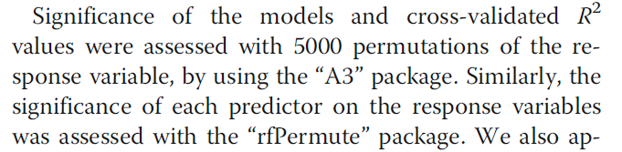 randomForest包实现不了的功能,那就用其它R包进行补充呗。至于用哪些R包可以,文献中通常都有详细的方法描述,仔细看一下材料方法部分大致就明确了。就以上面的Jiao等(2018)的文章为例,材料方法部分提到可通过A3包可获取对全模型显著性的估计,并可通过rfPermute包可获取对随机森林中预测变量重要性的显著水平估计。
