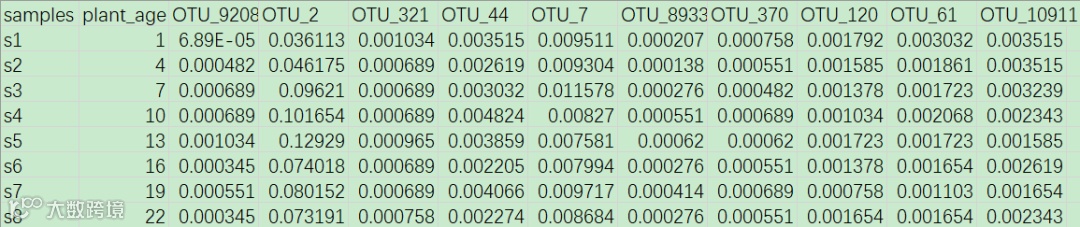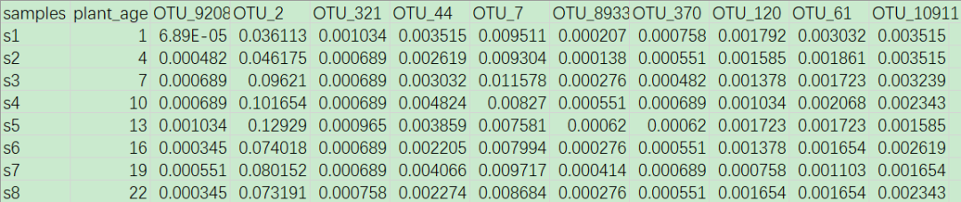 其中,samples列为45个样本的名称;plant_age记录了这45个根际土壤样本对应的植物生长时间(或称植物年龄),时间单位是天;其余10列为10种重要的细菌OTU的相对丰度信息,预先根据某些统计方法筛选出来的,它们已知与植物生长时间密切相关。