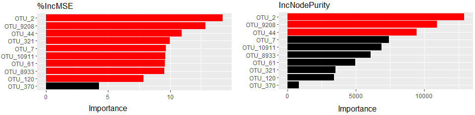 函数importance()给出了预测变量(10个细菌OTU)的相对重要性得分。“%IncMSE”即increase in mean squared error,通过对每一个预测变量随机赋值,如果该预测变量更为重要,那么其值被随机替换后模型预测的误差会增大。“IncNodePurity”即increase in node purity,通过残差平方和来度量,代表了每个变量对分类树每个节点上观测值的异质性的影响,从而比较变量的重要性。两个指示值均是判断预测变量重要性的指标,均是值越大表示该变量的重要性越大,但分别基于两者的重要性排名存在一定的差异。至于选择哪一个更合适,自己看着来吧。