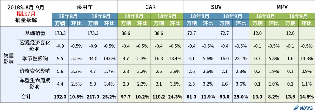 综合各销量影响因素,预期整体乘用车市场2018年9月零售量相比7月,在基础销量上有25.2%的增量。其中,季节性上升带来19.6%的增量;预期9月经销商为刺激消费者购车,加上进口车受关税调整政策的影响,降价促销带来2.7%的增量;预计三至四季度各厂商均有新车型陆续投放市场,生命周期指数上升带来3.4%的增量。