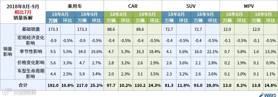 首先,CAR市场相比2018年7月, 9月在基础销量上增量24.3%。季节性上升是CAR市场增长的主要因素,带来18.4%的增量;在零售走低及关税调整政策的影响下,预期9月经销商会通过降价促销刺激消费,价格变化带来2.9%的增量;预计8月CAR市场有较多重磅车型换代,如一汽大众-宝来、广本凌派、比亚迪秦、雅阁混动版等,车型生命周期指数上升带来3.5%的增量。