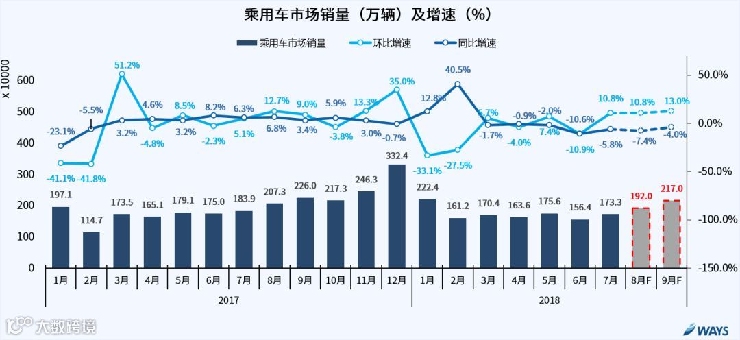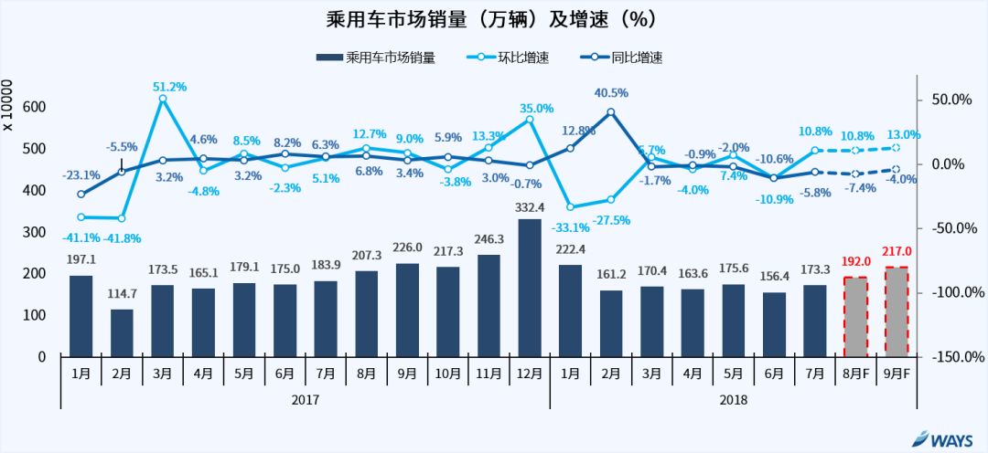 根据威尔森预测,2018年9月乘用车市场预测零售量为217万辆,同比下降4.0%,环比上升13.0%。