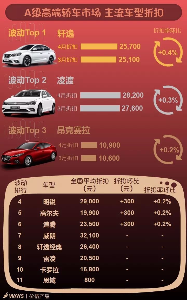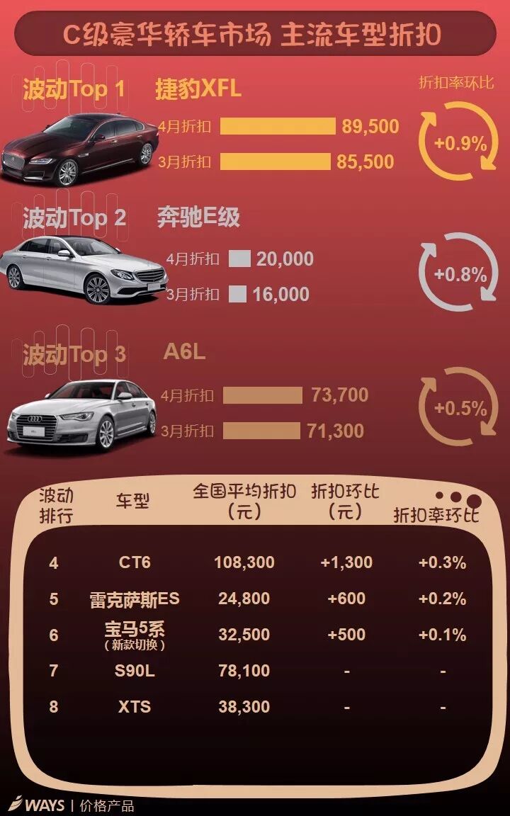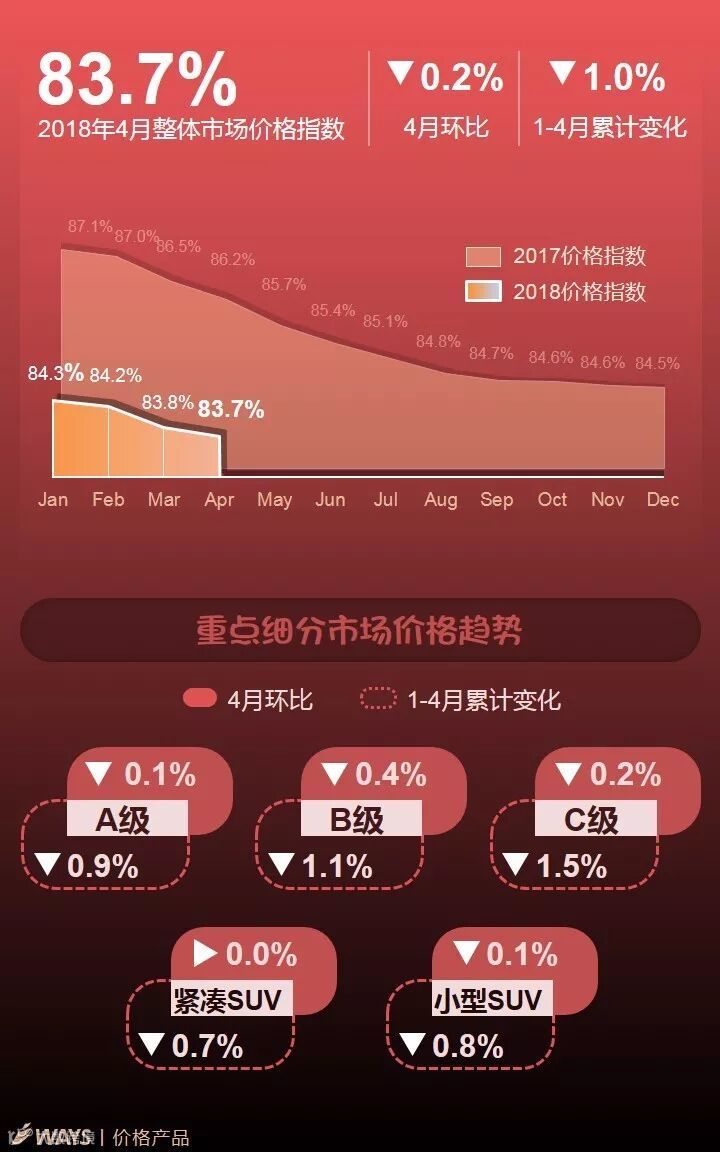 2018年4月上半月,第一季度结束后各地经销商并没有停止降价促销的步伐,整体市场价格仍有小幅下滑。豪华车细分市场价格降幅最大,B级和C级细分市场价格降幅分别为0.4%和0.2%。