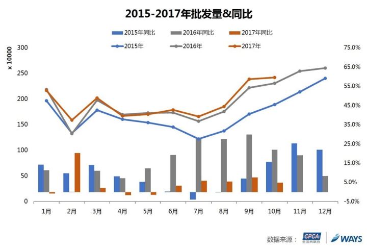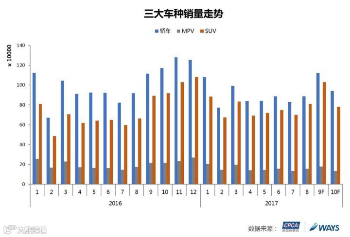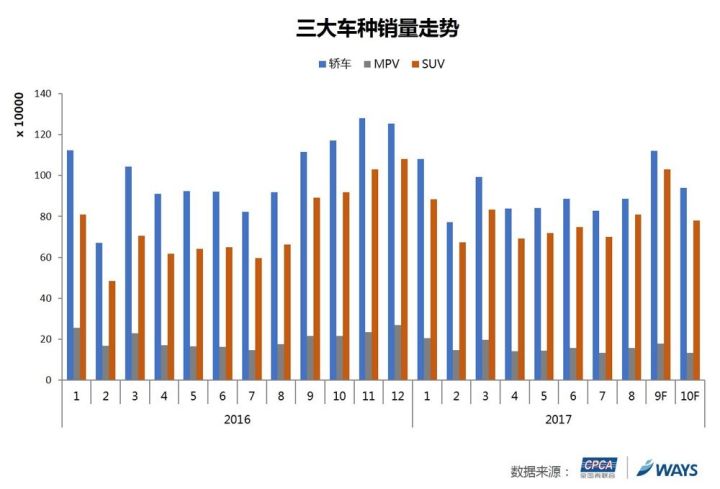 根据全国乘联会与威尔森的联合预测,10月整体乘用车市场批发量预计为:242.0万辆(*注:销量预测基于乘联会含出口的狭义乘用车批发量数据口径),同比2016年10月增长4.9%。其中轿车市场119.0万辆,同比增长1.5%;MPV市场17.0万辆,同比萎缩21.4%;SUV市场106.0万辆,同比增长15.3%。