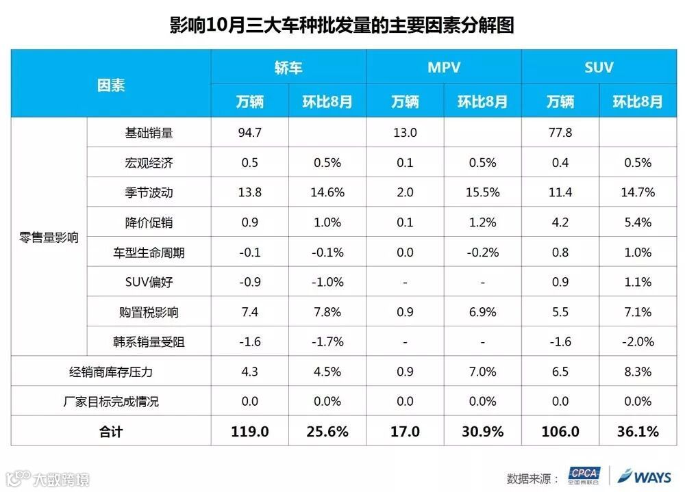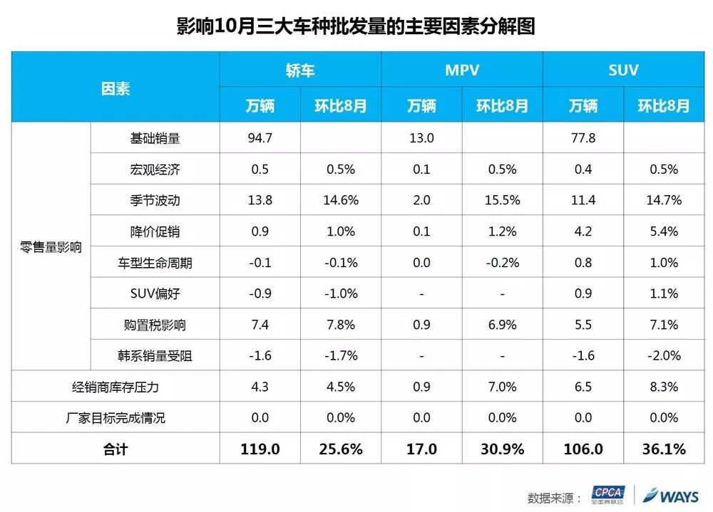 首先,相比8月,10月季节性上升,带来14.5%的增量;购置税优惠2.5%的政策红利持续影响,同时购置税优惠政策即将退出刺激消费,市场消费需求提前,共带来7.6%的增量;另外,经销商增加促销刺激销售,带来了2.1%的增量;批发零售差连续三个月回落,随着市场逐渐进入旺季,预期库存压力会持续减小,环比8月,带来7.4%的增量。