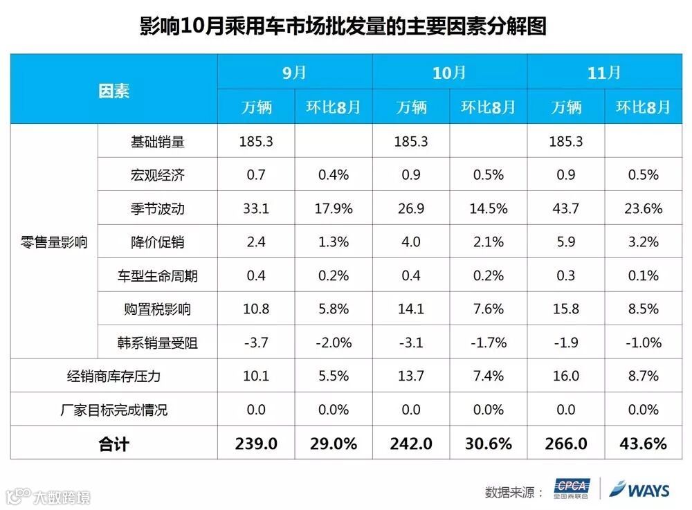 在综合因素作用下,环比8月,10月整体乘用车市场在基础销量上增加29.0%,其中,季节性上升、购置税影响、经销商库存压力缓解是促进10月批发量增长的主要因素;另外,受韩系销量持续下降影响,造成1.7%的减量。