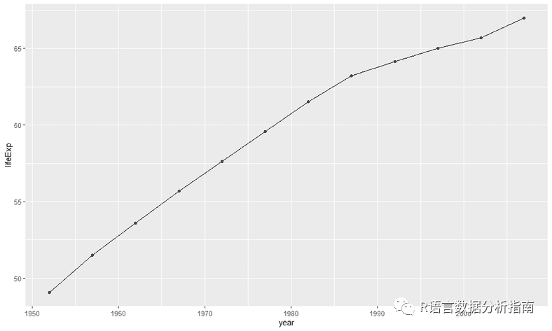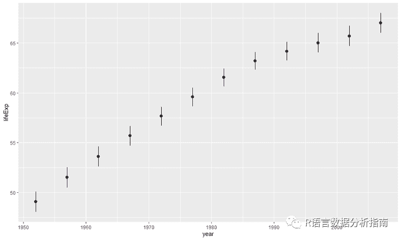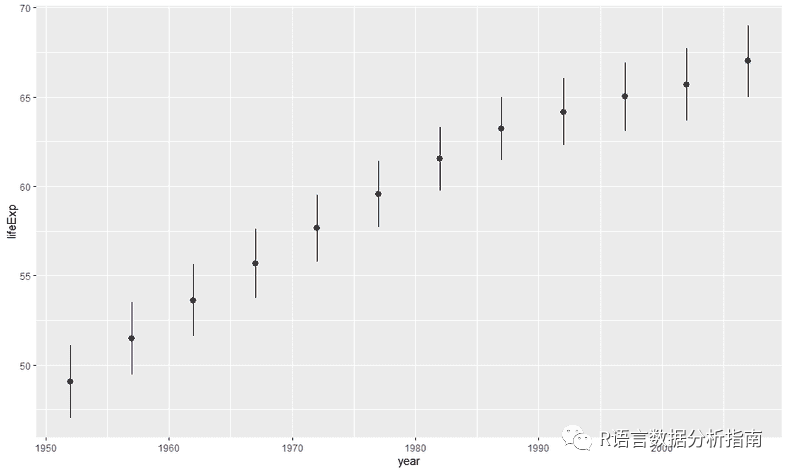 幸运的是,ggplot2的开发人员已经考虑了如何深入可视化统计信息的问题。解决方案是使用stat_summary函数。我们将使用gapminder数据集,其中包含有不同国家/地区人们的预期寿命数据