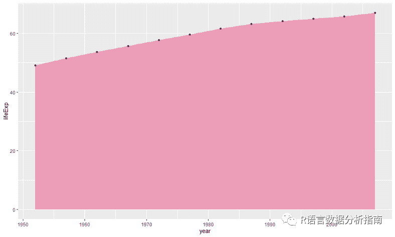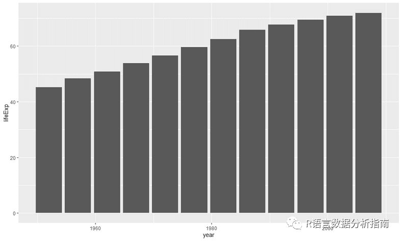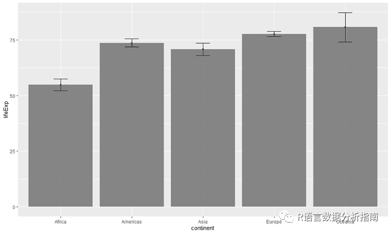 在此示例中,我们将两个参数传递给stat_summary函数。首先,我们告诉stat_summary fun.y = mean我们想要计算变量lifeExp的平均值。使用参数geom = "bar"我们告诉stat_summary将平均值显示为条形图