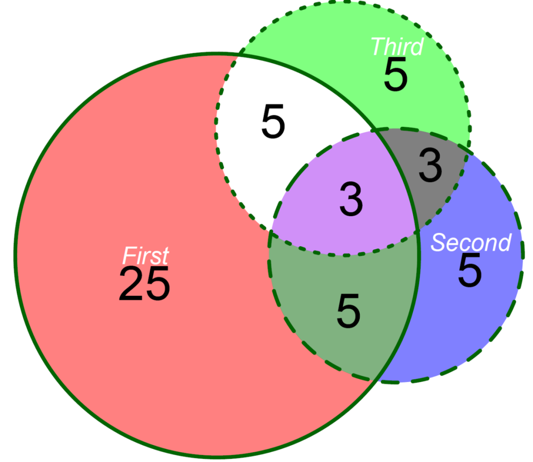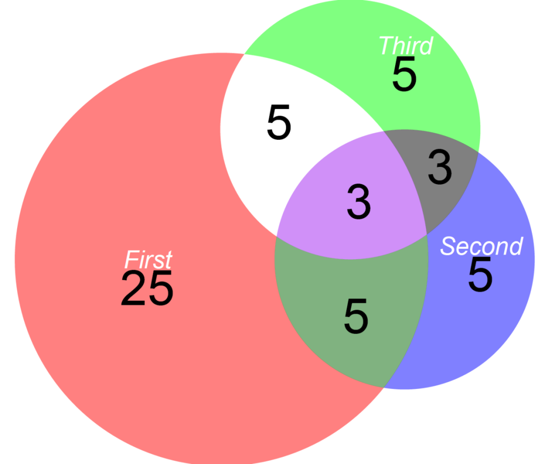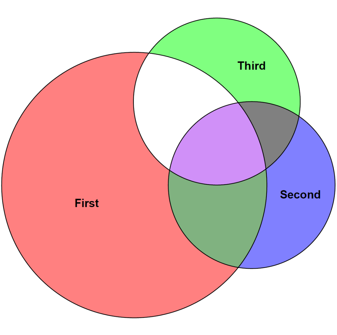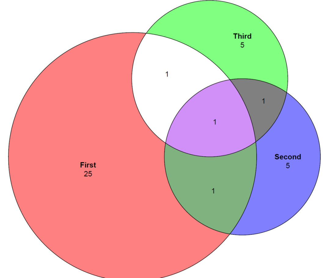 这几个包有一个缺点就是最终呈现的图不是按照数据集的实际比例来的。每个部分的圆或者椭圆大小都一样。如果想要按照数据集的实际比例来,之前我尝试过Y叔的推文 https://guangchuangyu.github.io/cn/2018/04/ggvenn/
