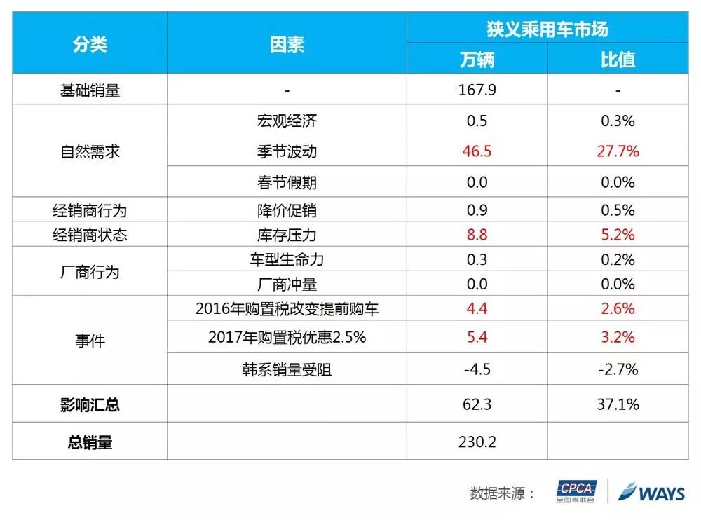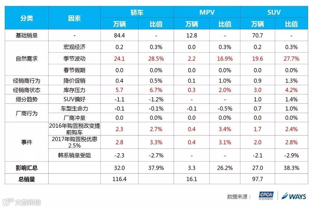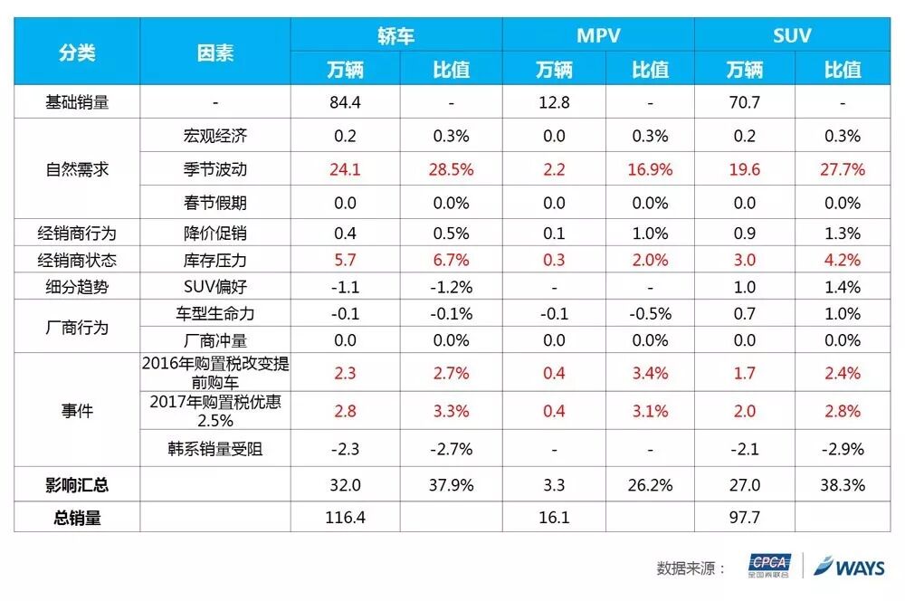 其次,MPV市场受各因素综合影响,在基础销量上有26.2%的增量;其中,季节性上升带来16.9%的增量;另外,库存压力有所缓解带来2.0%的增量,购置税影响带来6.5%的增量。