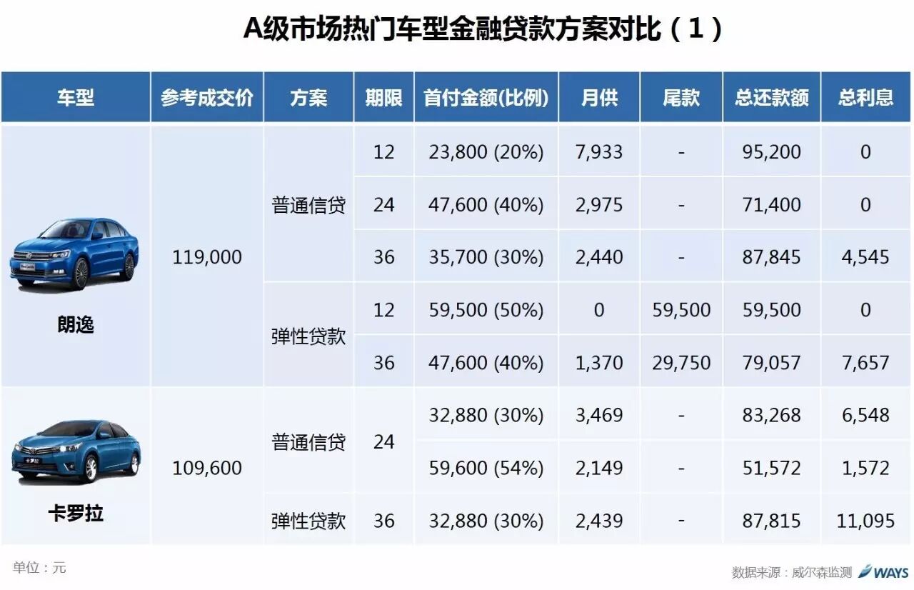 首先来看看A级市场的情况。我们挑选了朗逸、卡罗拉、轩逸、福睿斯四款热门车型,其中上汽大众旗下的朗逸提供了12、24、36期多种贷款方案,“最长36期”、“最低20%首付”、“最低零利息”吸引力十足。