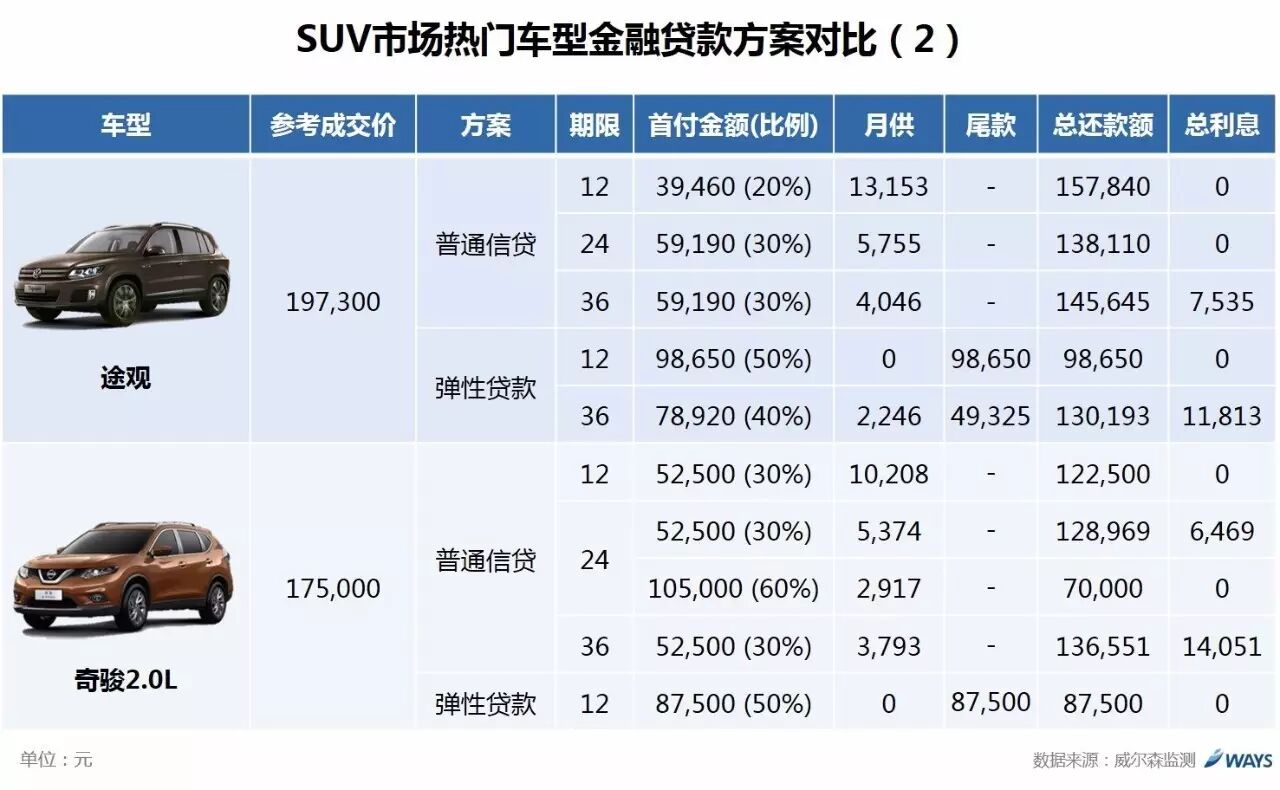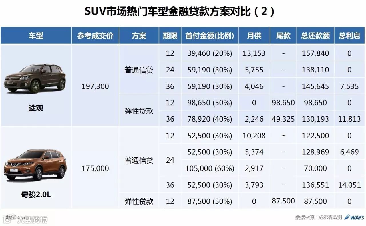 途观贷款方案同样全面,其中36期普通信贷产品的最低首付也仅需30%,月供仅为4046元,对比市场其他SUV车型的贷款方案,可以说是相当诱人。