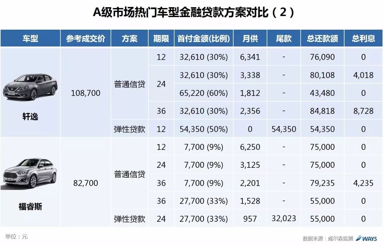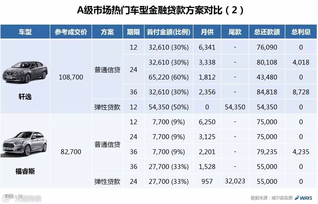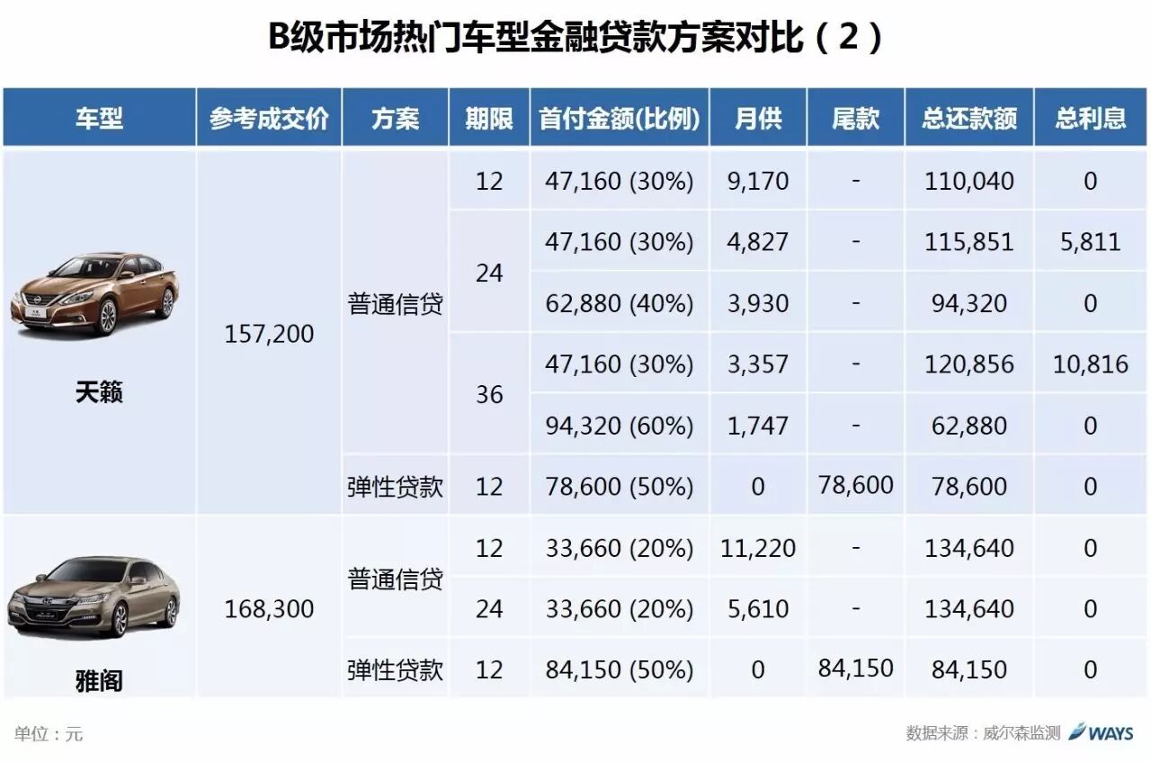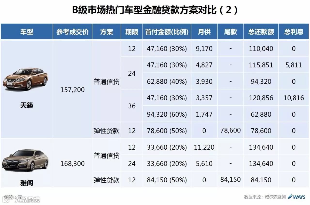 当然,如果觉得月供总得每月操个心,太麻烦,也可以选择“首付+尾款”组合的弹性贷,首付50%,一年后再一次性付清剩下的50%,零利息。适合前期有较充足购车资金,并对未来一年还款能力相当乐观的消费者。迈腾、帕萨特、天籁以及雅阁这四款车型均有此类弹性贷款购车方案。