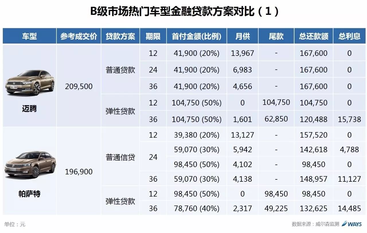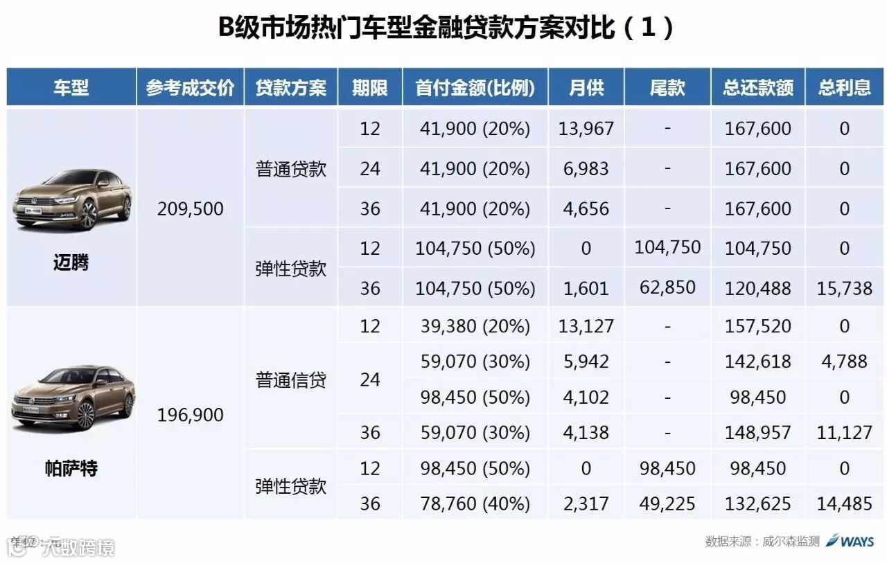 B级市场方面,我们来看看迈腾、帕萨特、天籁以及雅阁四款热门车型。一汽大众为迈腾打造了多维的贷款方案,最低20%首付、最低零利息,分期付款12期、24期、36期任君挑选。