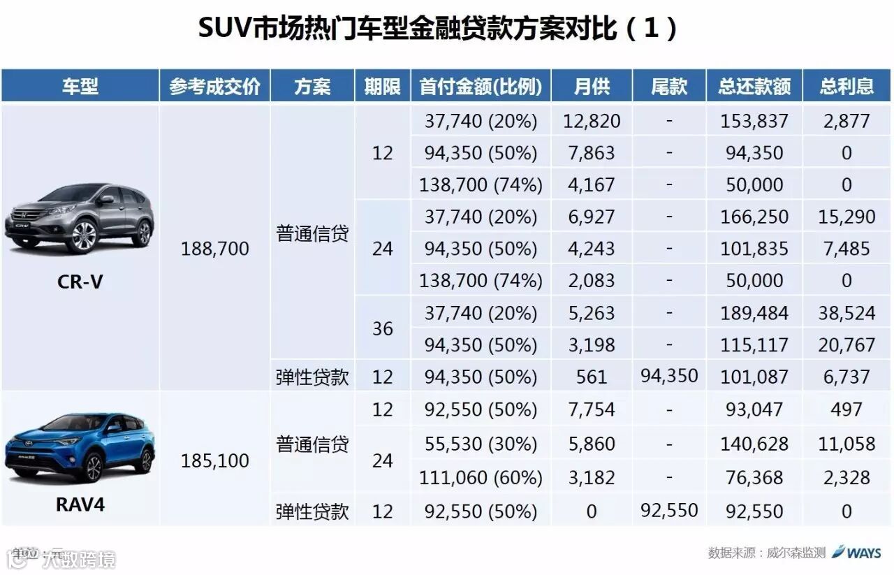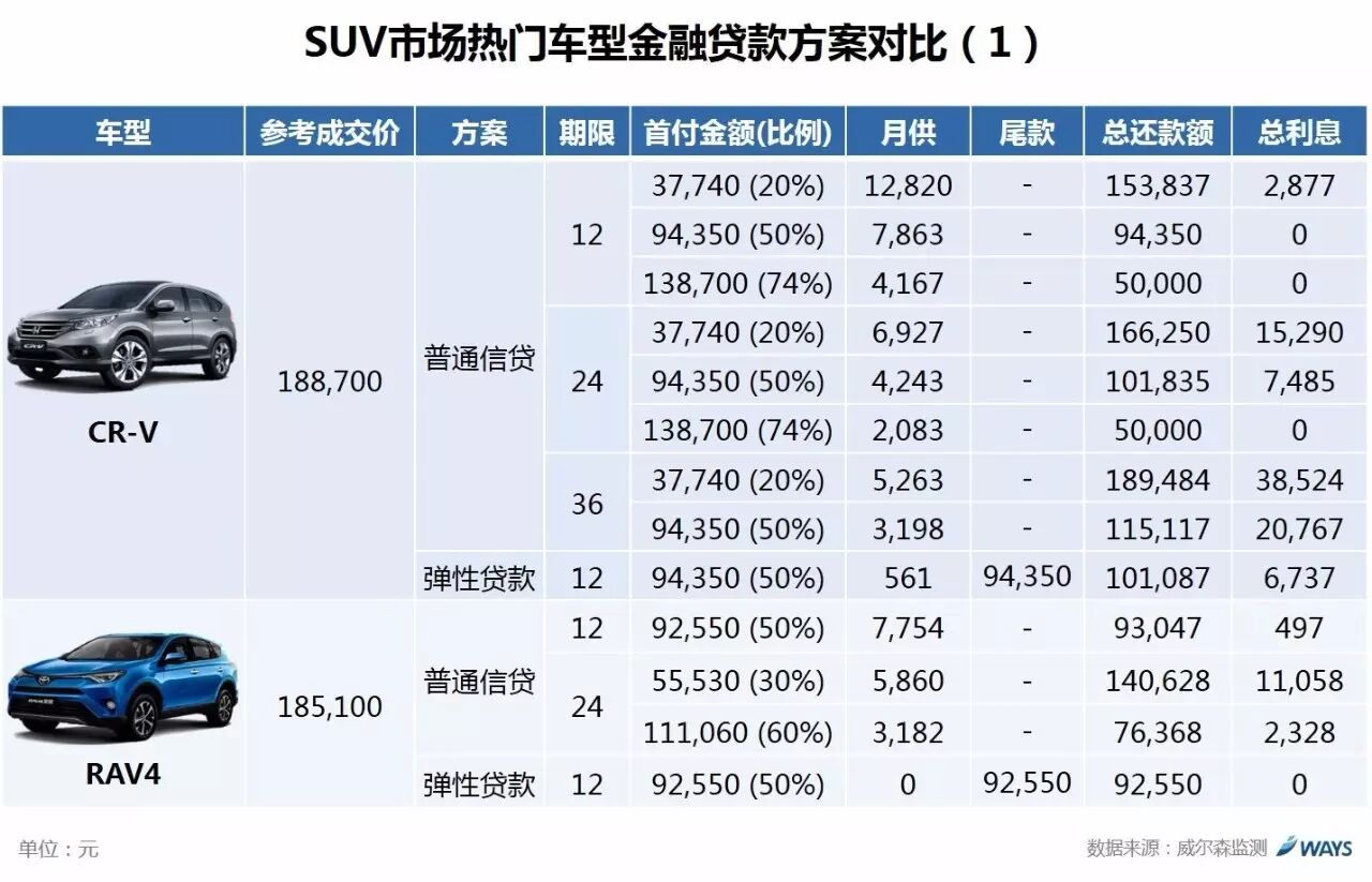 在一直相当火爆的SUV市场,我们再看看大家比较关注的途观、奇骏、CR-V以及RAV4的情况。东风本田CR-V总共有9款贷款方案,低首付、零利息、低月供、长还款期,不同贷款期限及首付比例供不同类型消费者灵活选择。