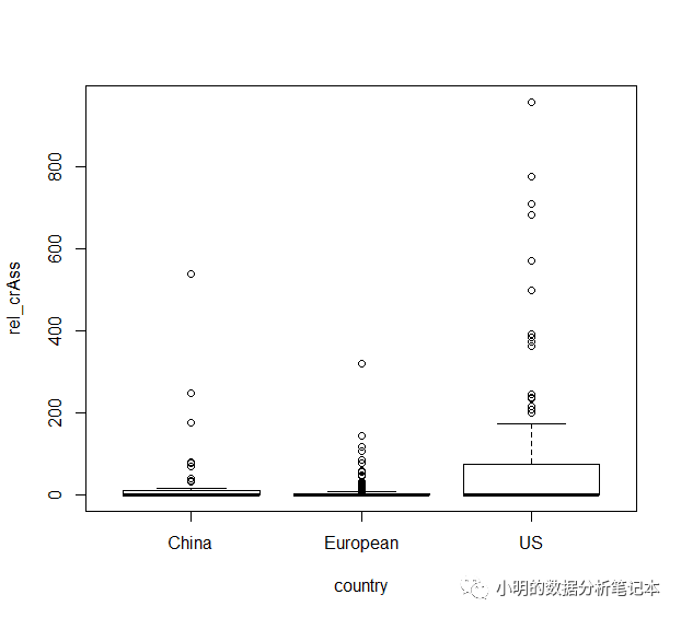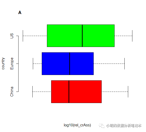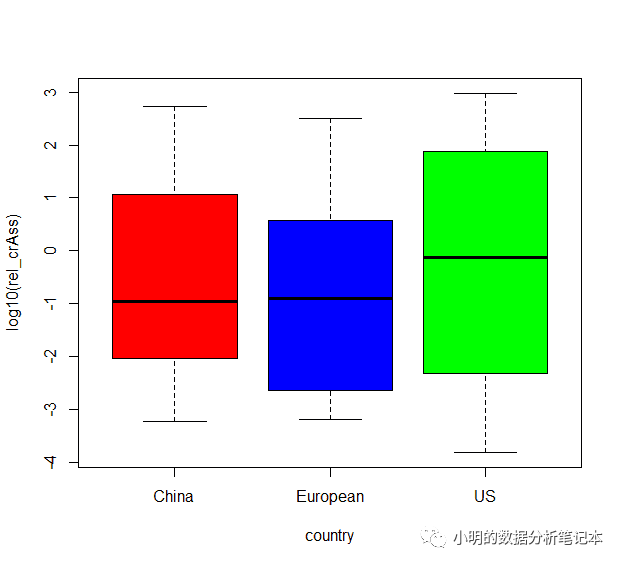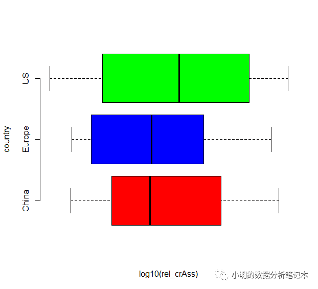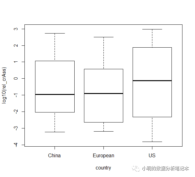 做箱线图用到的数据是 rel_crAss 和 country,country是分类变量,rel_crAss是连续变量,画图的时候对这个数值进行了log10转换