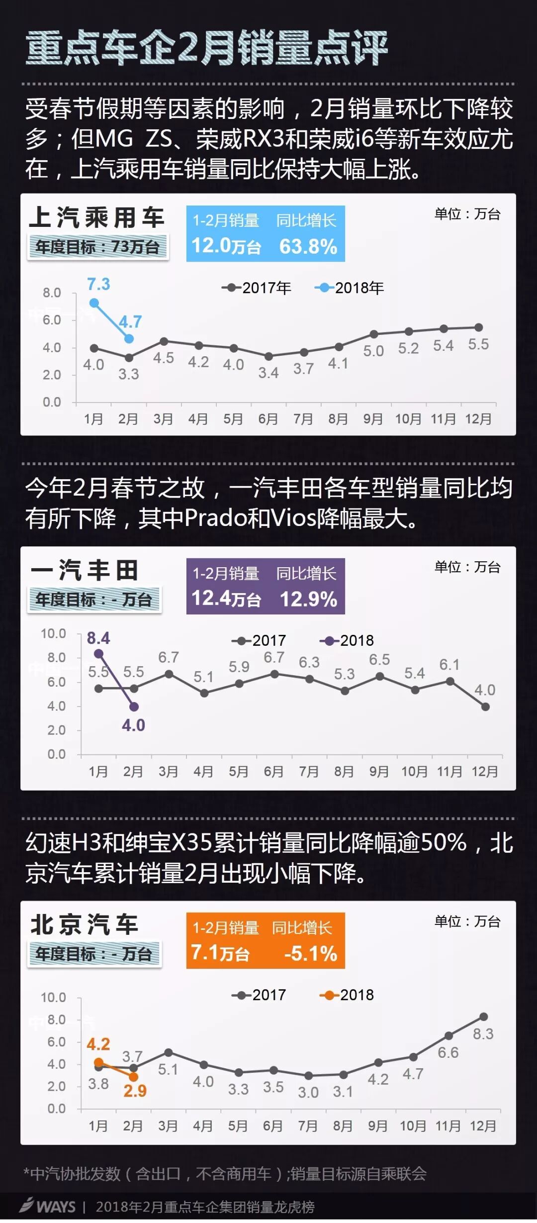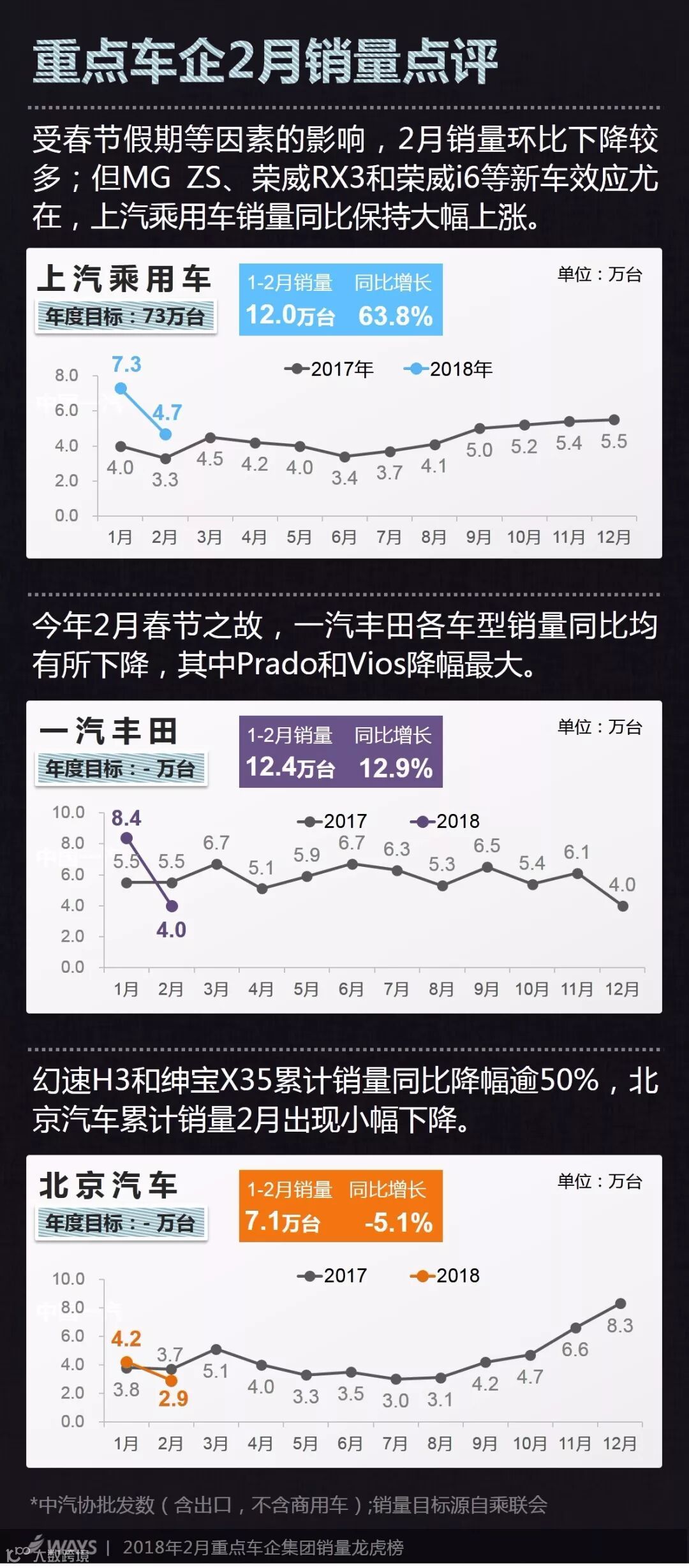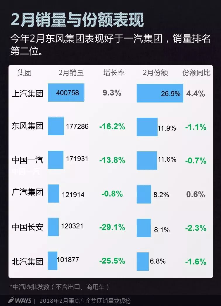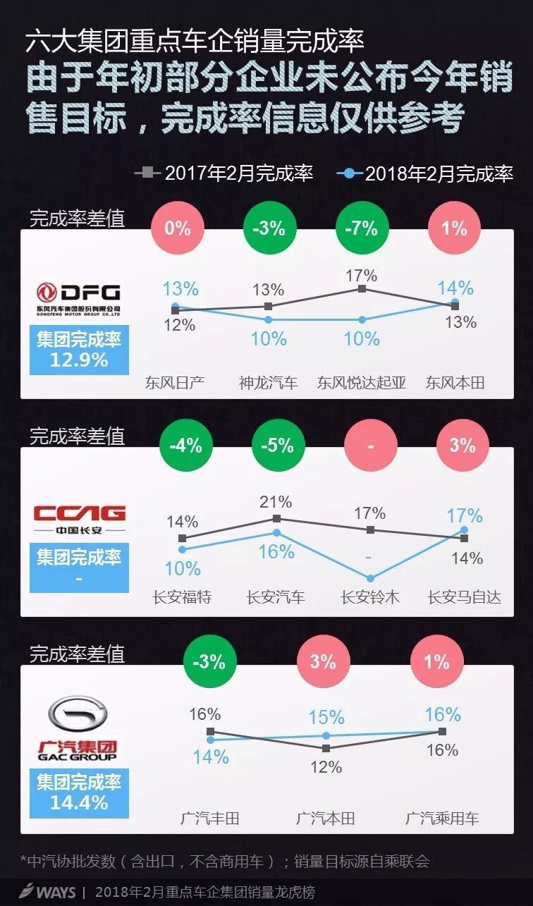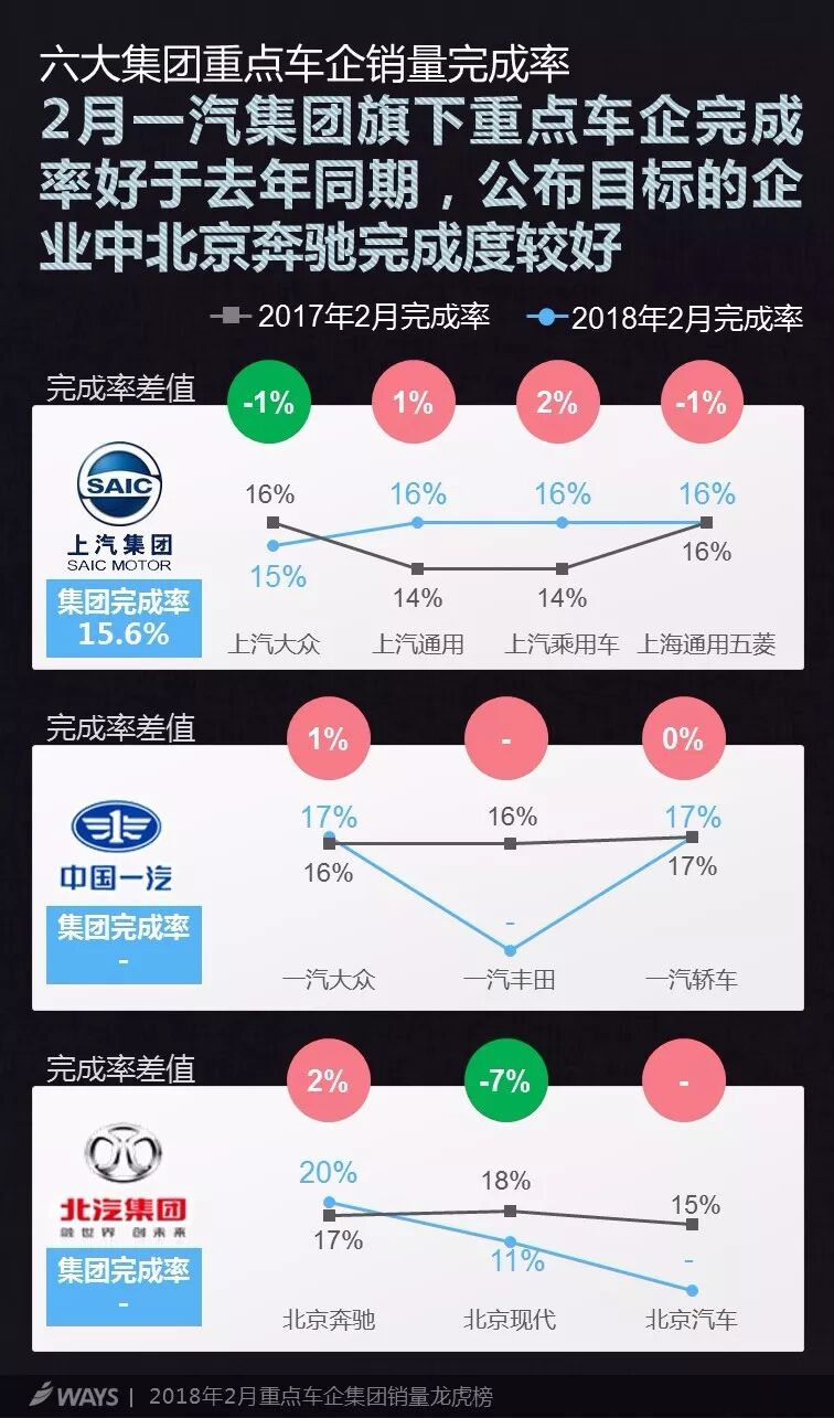 2018年2月,东风集团表现好于一汽集团,销量排名第二位。一汽集团旗下重点车企完成率好于去年同期,单车企来看,北京奔驰完成度较好。由于年初部分企业未公布今年销售目标,完成率信息仅供参考。