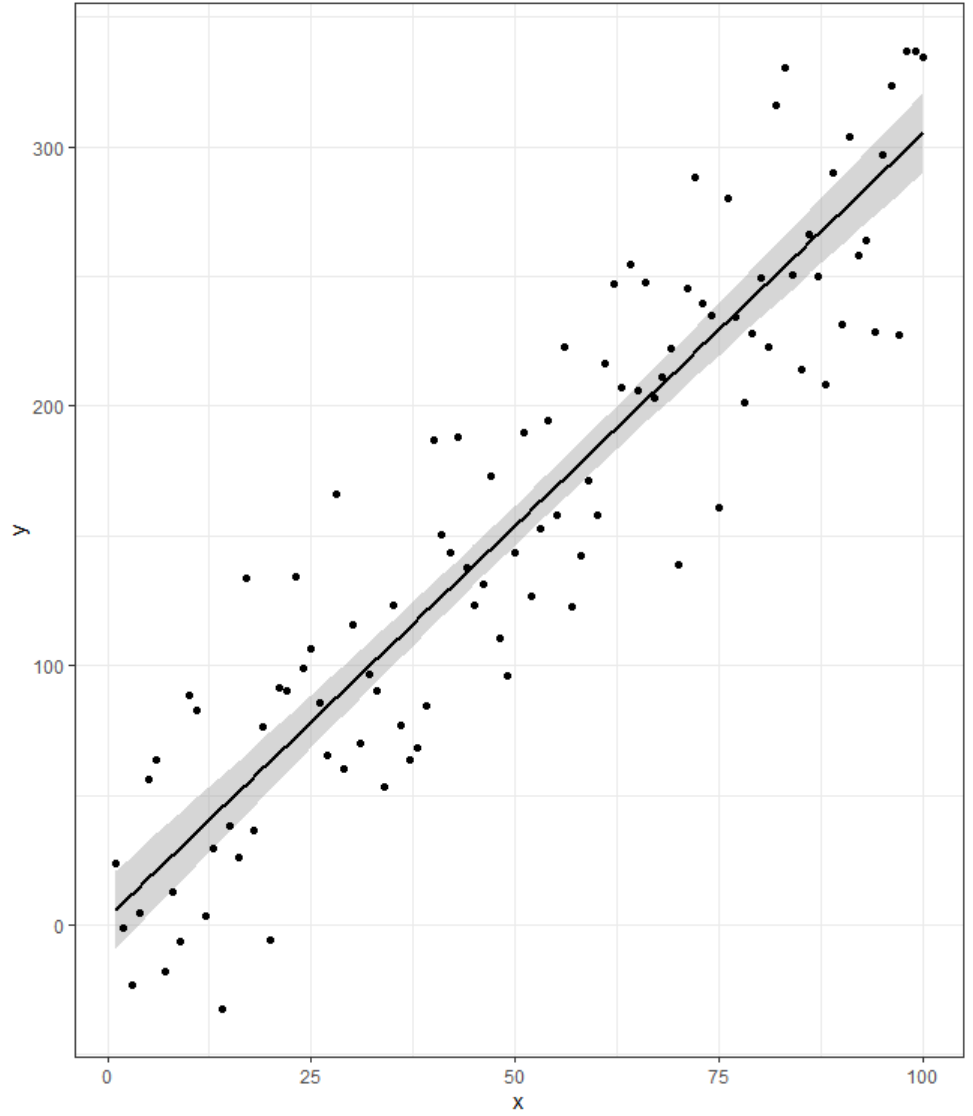 df$y <- 2 + 3 * df$x + rnorm(100, sd = 40)