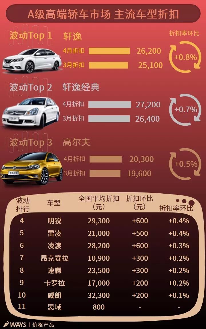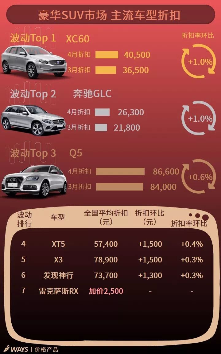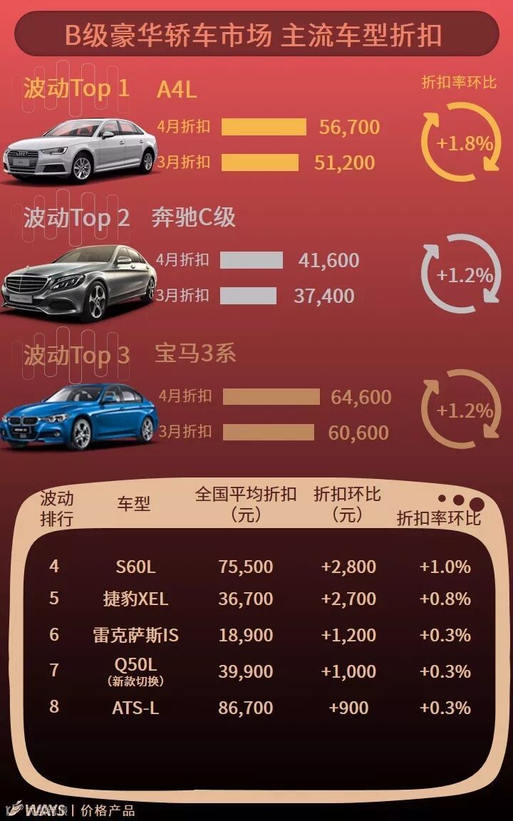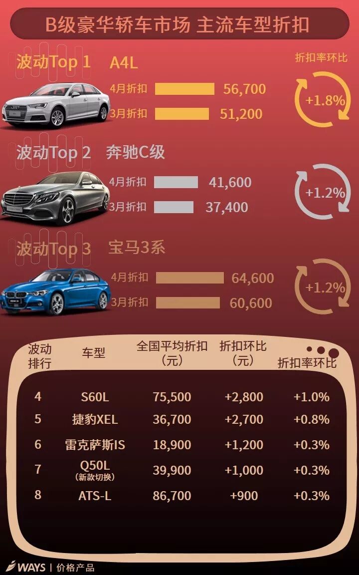车型方面,奥迪A4L终端优惠增加5,500元,折扣达56,700元,折扣率增加1.8%;宝马3系和5系终端降价均在4,000元以上;奔驰GLC与C级也不甘示弱,终端价格降幅均达1.0%以上;ix25和XR-V等小型SUV价格降幅也在1.0%左右。