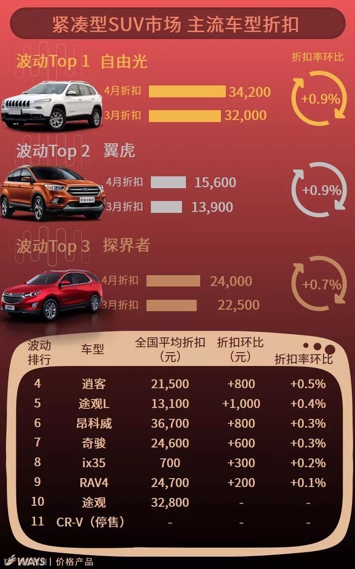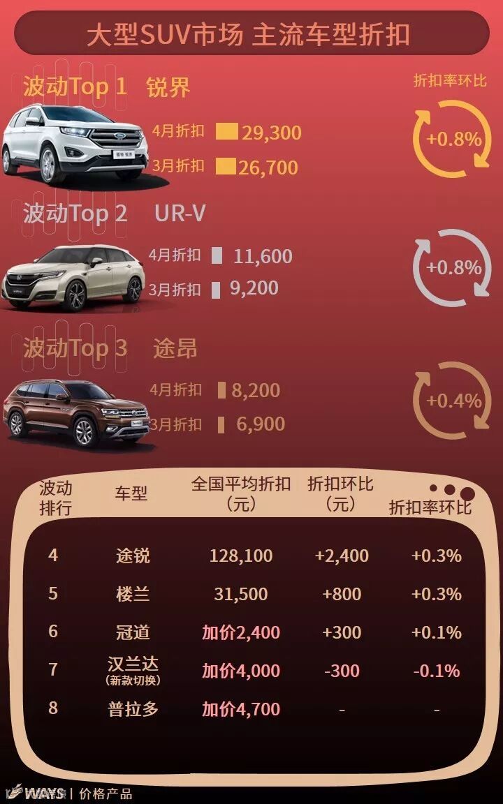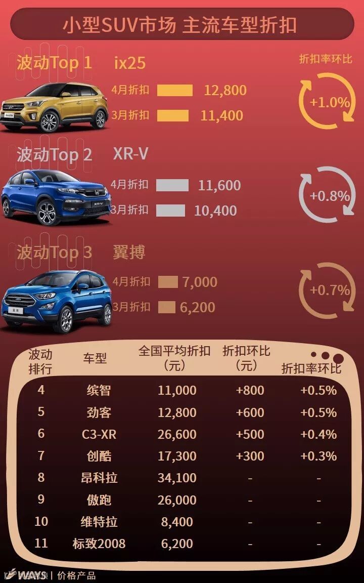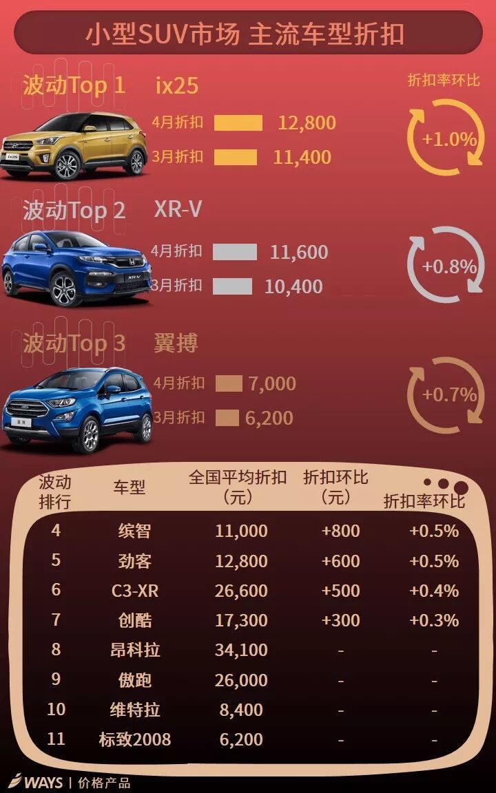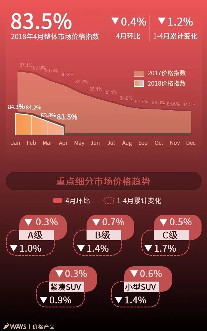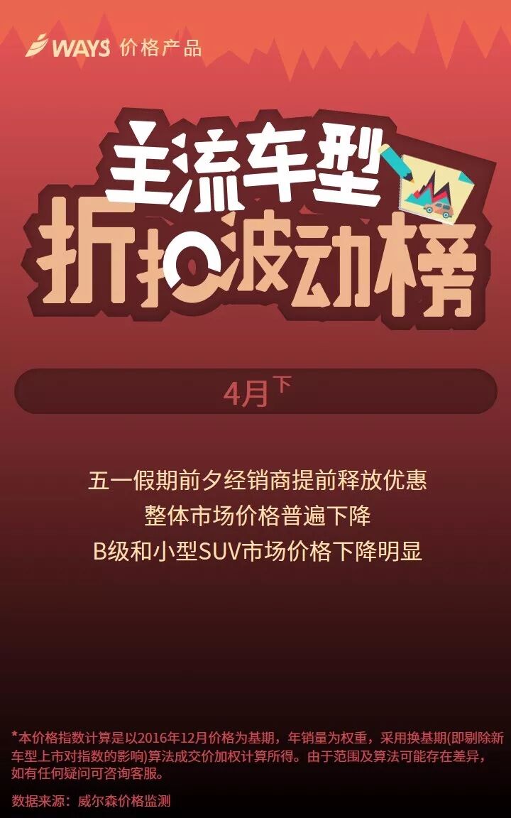 2018年4月下半月,五一假期前夕,各地经销商提前释放优惠,整体市场价格下降明显,其中B级和小型SUV细分市场价格下降较多,达到0.6-0.7%。