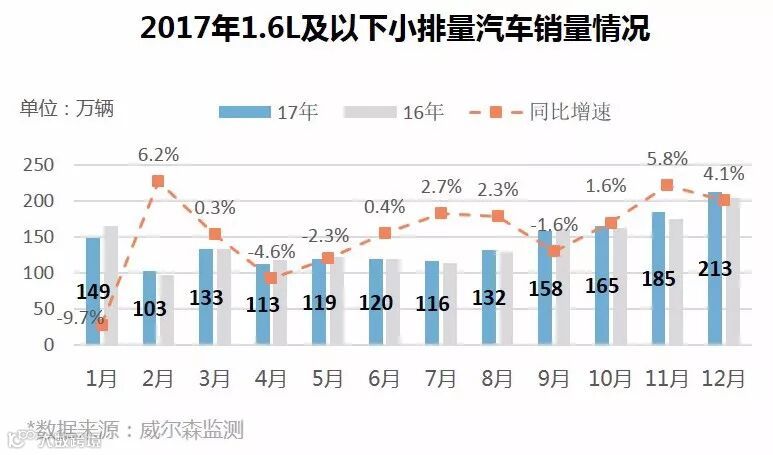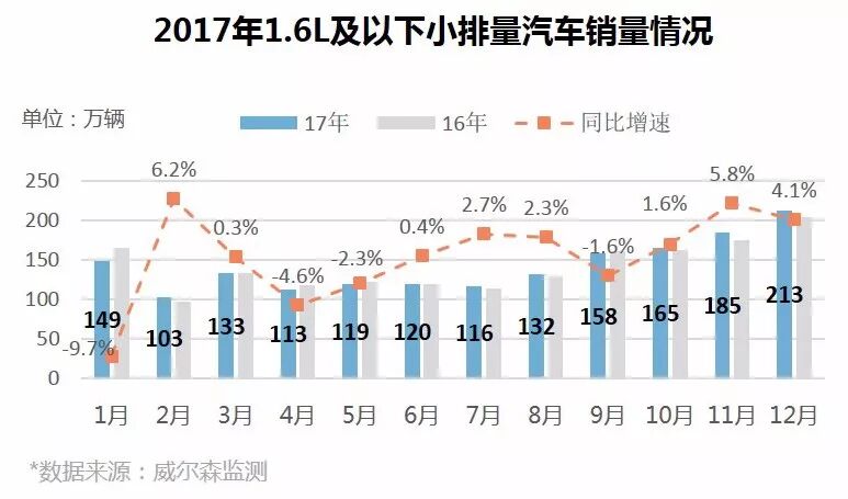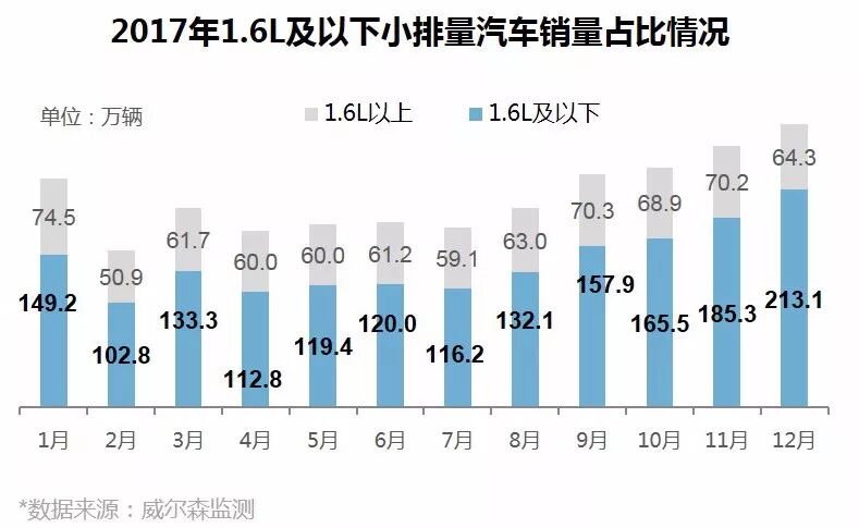 据此前的《关于减征1.6升及以下排量乘用车车辆购置税的通知》,自2018年1月1日起,1.6L及以下排量汽车购置税正式恢复至10%。据威尔森监测数据显示,2017年全国1.6L及以下排量乘用车销量为17,077,776辆,同比增长0.4%。自2017年下半年起,1.6L及以下排量乘用车销量占比不断攀升,达近7成,成为乘用车销量的主力军。
