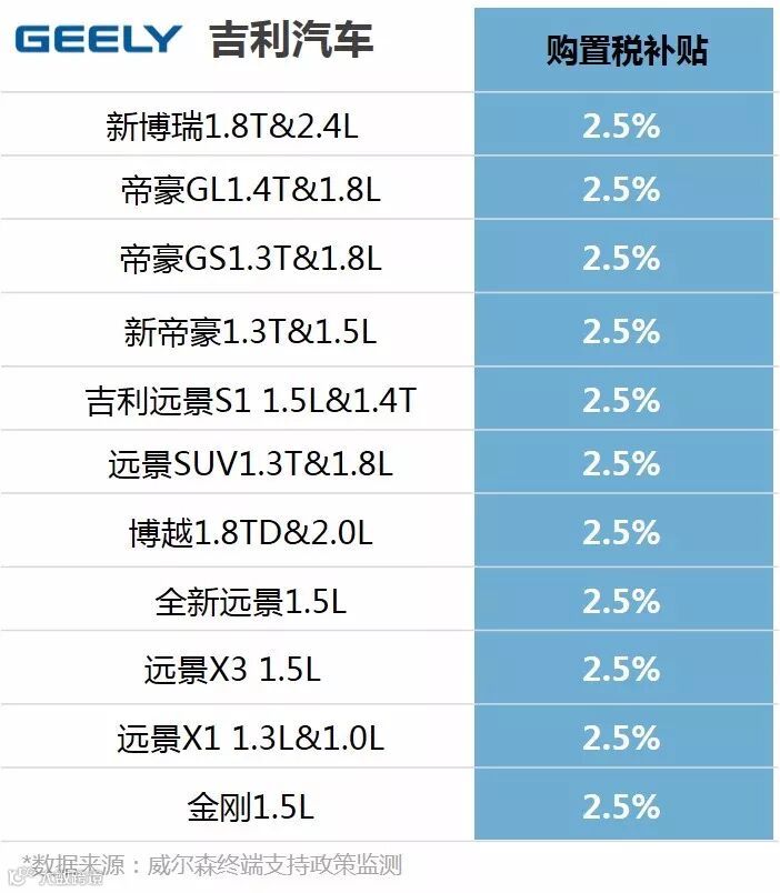吉利汽车推出全系车型“补贴2.5%购置税,延续至2018年2月28日”活动,补贴车型有:新博瑞1.8T&2.4L、帝豪GL1.4T&1.8L、帝豪GS1.3T&1.8L、新帝豪1.3T&1.5L、吉利远景S1 1.5L&1.4T、远景SUV1.3T&1.8L、博越1.8TD&2.0L、全新远景1.5L、远景X3 1.5L、远景X1 1.3L&1.0L、金刚1.5L。延续购置税补贴给予错过补贴政策的消费者再次享受购置税补贴的机会,从而延续消费者的购买热情。