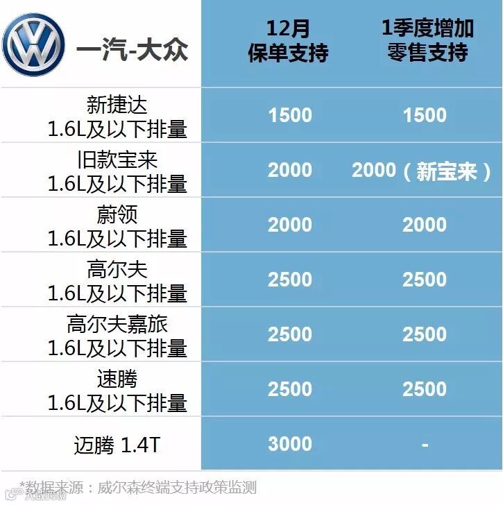 一汽-大众2017年12月8日发布《2017年12月1.6L及以下排量车辆保单支持政策》,对12月1.6L及以下排量车辆开展保单支持,对12月下单且在12月31日未交付的订单给予单车支持。