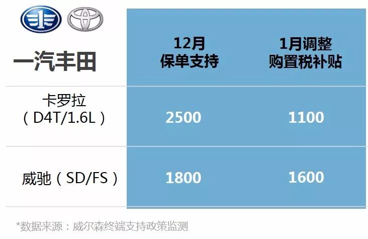 2018年1月一汽丰田再次调整购置税补贴,卡罗拉约为1100元,威驰(SD/FS)约为1600元,与11-12月下发购置税延续的保单政策二选一(11-12月已下订单且未完成交车的客户保单政策与1月下发的购置税补贴二选一,而1-2月新交车的订单客户只有购置税补贴)。