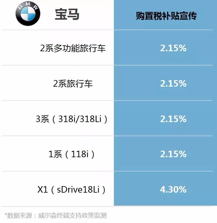 宝马2017年第一季度给予小排量车型销售折让(基于建议零售价),经销商满足完成总体零售要求70%以上(含)条件的,对2系多功能旅行车、2系旅行车、1系(118i)、3系(318i/318Li)车型零售给予2.15%(含税)以及X1(sDrive18Li)4.3%(含税)的销售折让,建议经销商补贴客户购置税。