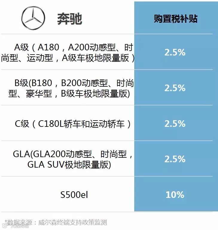 奔驰2018年1月1日-2018年2月28日对于消费者购买A级、B级、C级、GLA等部分型号给予2.5%的购置税补贴,而对S500el则给予10%的购置税补贴(与金融支持二选一,如与金融支持同享,则享受5%的购置税补贴),如实际购置税金额小于官方指导价(不含税)的2.5%,则补贴金额将以实际购置税金额进行补贴,如实际购置税金额超过官方指导价(不含税)的2.5%,则按官方指导价(不含税)的 2.5%进行补贴。