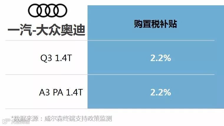 一汽-大众奥迪2018年1月1日-3月31日,对国产车Q3 1.4T的车型延续2017年第四季度的购置税补贴,对A3 PA车型新增1.4T购置税补贴,即给予市场指导价基础上2.2%的购置税补贴支持。购置税补贴力度比购置优惠税退坡后需多交的税额稍大,促进经销商利用厂家购置税补贴政策扩大宣传,增强集客。