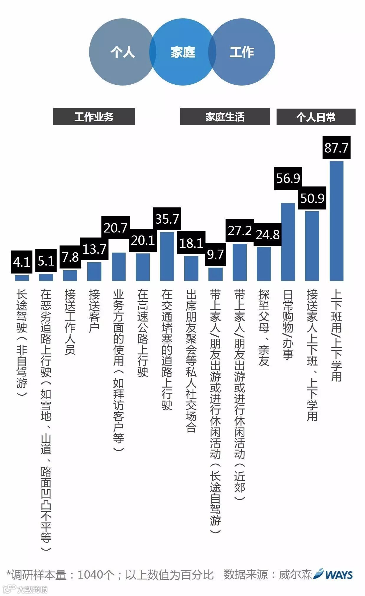 而关于消费者对新能源汽车的使用,主要围绕个人日常、家庭生活及工作业务三大方面。