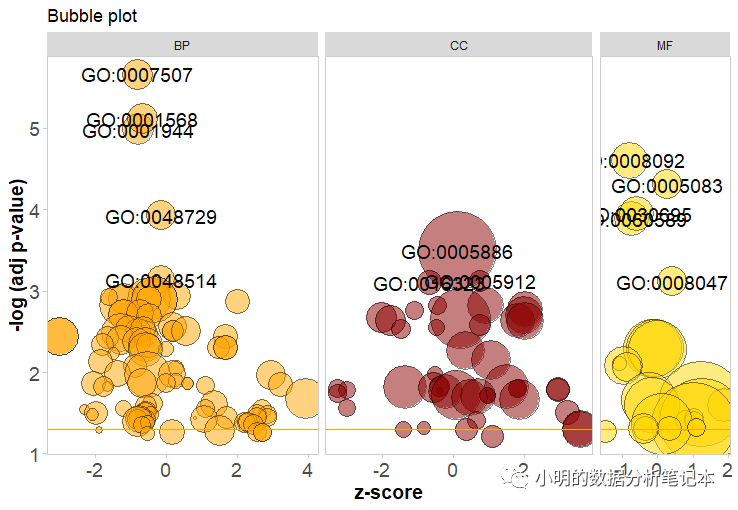 GOBubble(circ, title = 'Bubble plot', colour = c('orange', 'darkred', 'gold'), display = 'multiple', labels = 3)