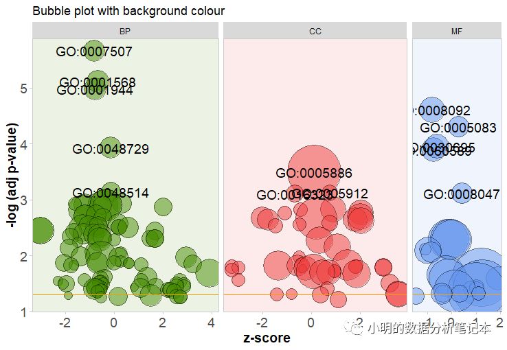 GOBubble(circ, title = 'Bubble plot with background colour', display = 'multiple', bg.col = T, labels = 3)