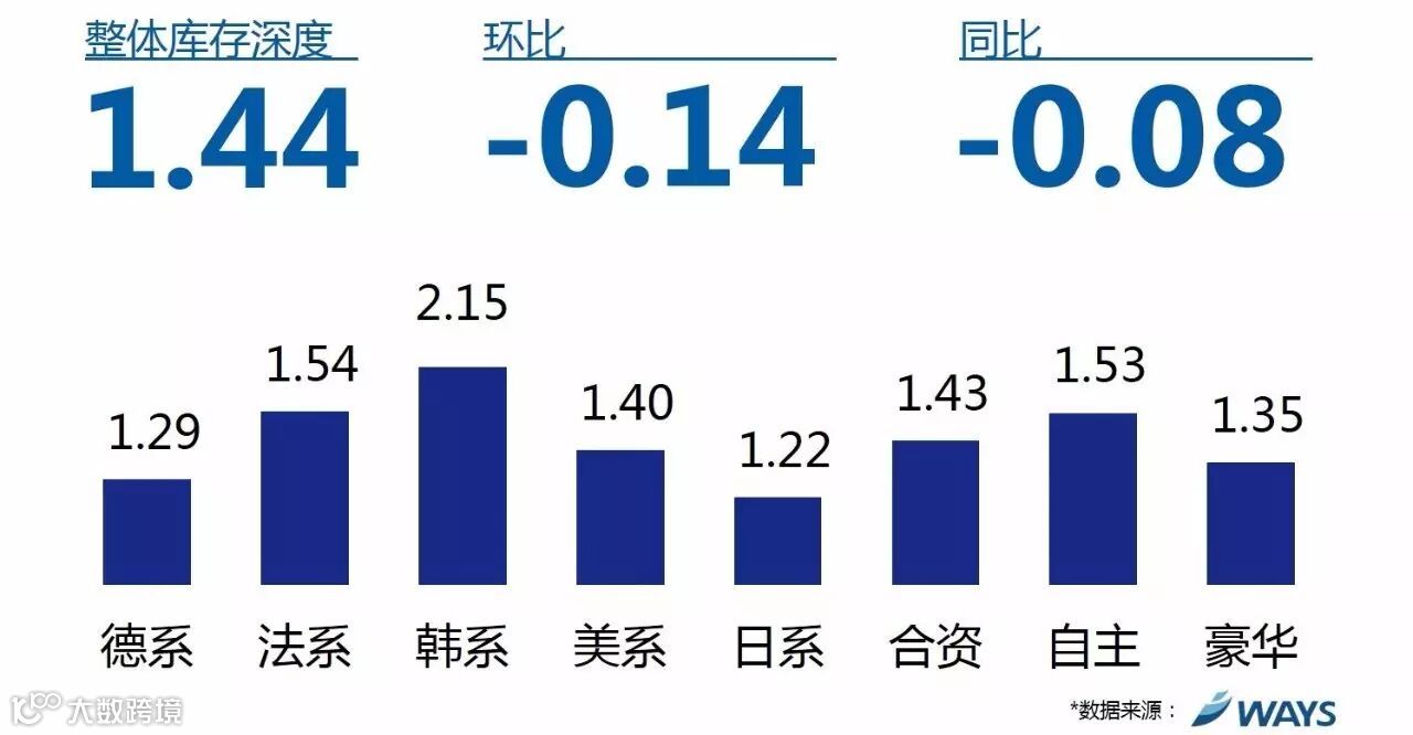 根据威尔森市场监测数据,7月经销商整体库存深度为1.44,环比下降0.14,同比下降0.08,经销商库存压力有所缓解。