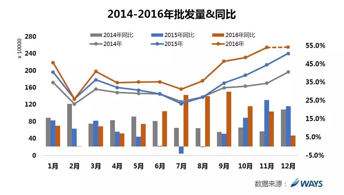 因此,综合以上分析,威尔森预测12月整体乘用车市场批发量预计为255万辆。展望2017年,预期随着购置税优惠减半,全年销量增速回落;而1月则因月底春节假期以及提前购车影响,批发量或将小幅回落。