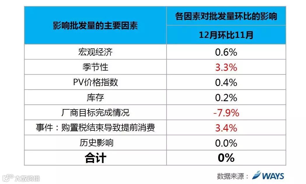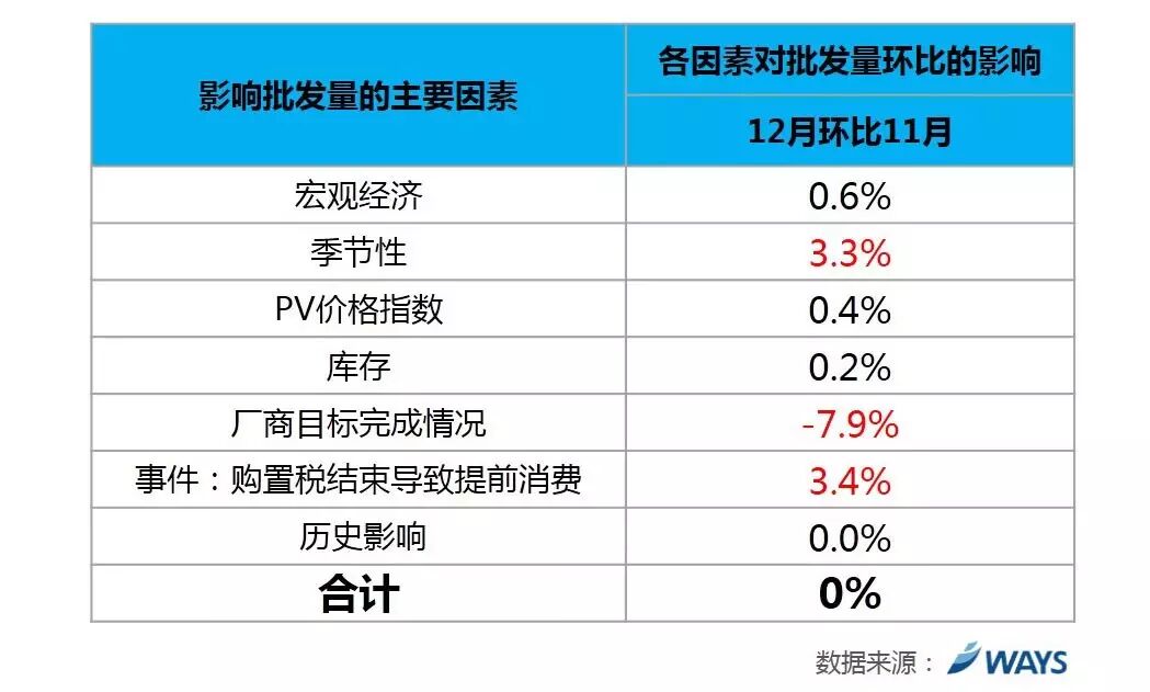 12月批发量变化的关键因素是厂商目标完成情况、年底销售旺季、购置税。其中因各厂商批发目标完成程度较好,12月主动放缓批发节奏,拖累12月批发量增长。